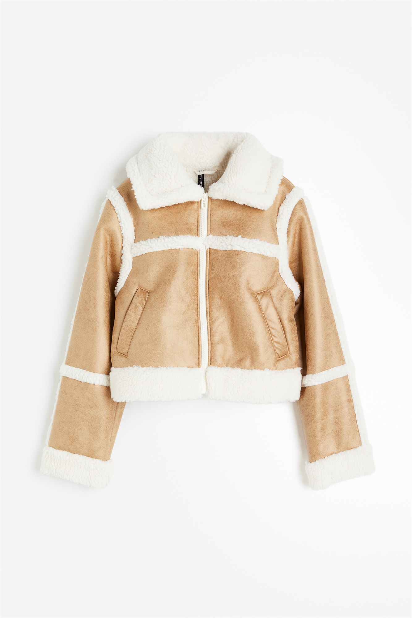 Короткая куртка в стиле бокс с большим воротником, манжетами, подолом и подкладкой из мягкого тедди. Застежка-молния спереди, длинные рукава и диагональные прорезные карманы спереди.