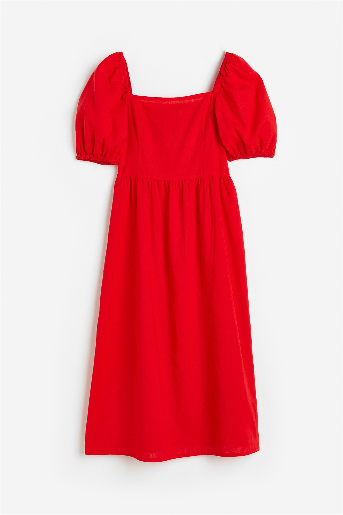 Платье длиной до колен из хлопка и льна. Облегающий лиф с квадратным вырезом спереди и сзади, а также отделка платочной вставкой сзади. Короткие пышные рукава с эластичными манжетами и расклешенная юбка. Без подкладки.