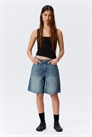 Пара свободных джинсовых шорт длиной до колен с низкой талией, созданных из жесткого денима из органического хлопка с добавлением переработанного хлопка. Эти шорты имеют классический дизайн с пятью карманами и подогнутые края.