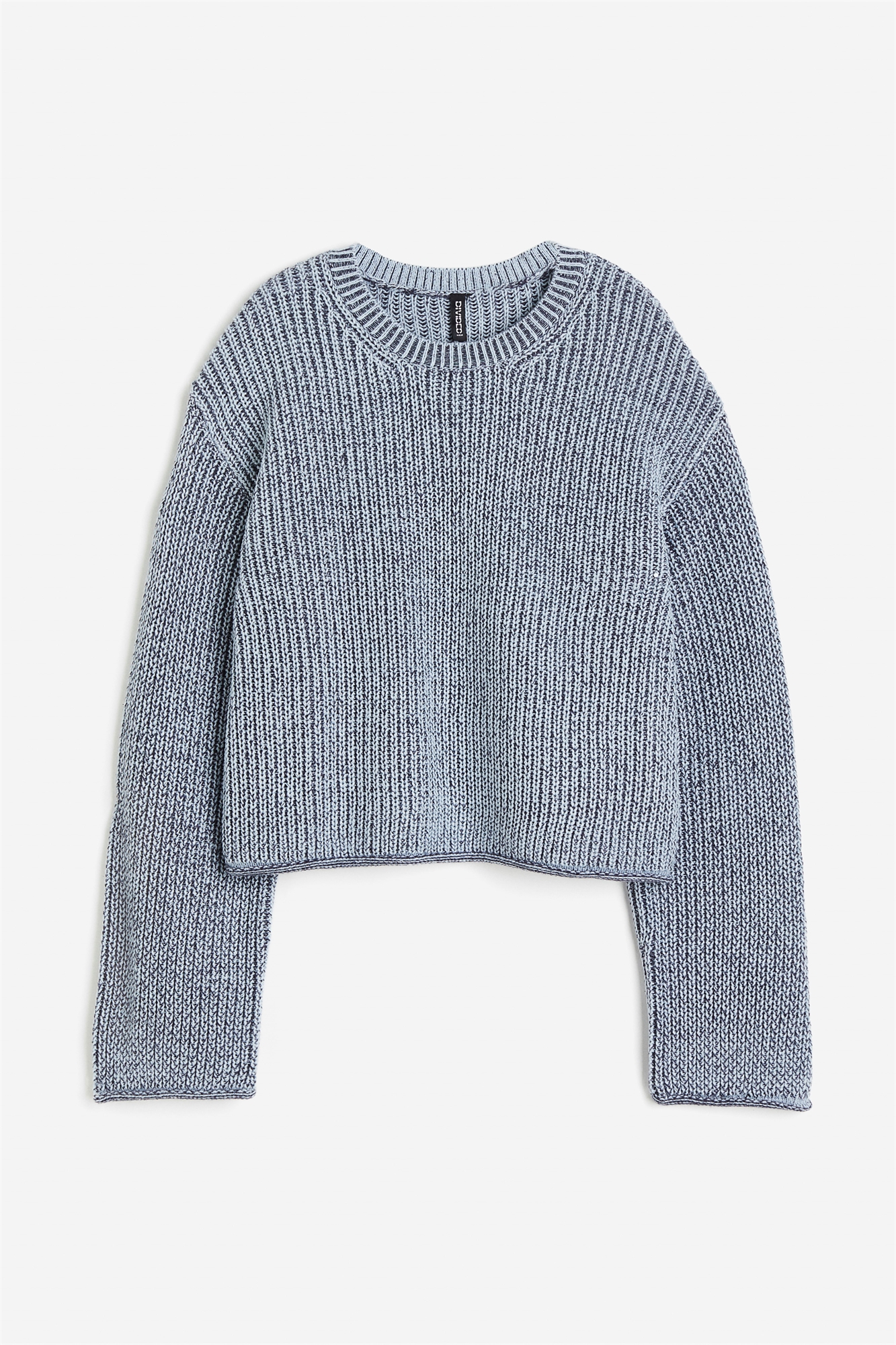 Джемпер свободного кроя из мягкого трикотажа с круглым вырезом, отделанным ребрами, спущенными плечами и длинными рукавами. Манжеты и подол отделаны кантом.