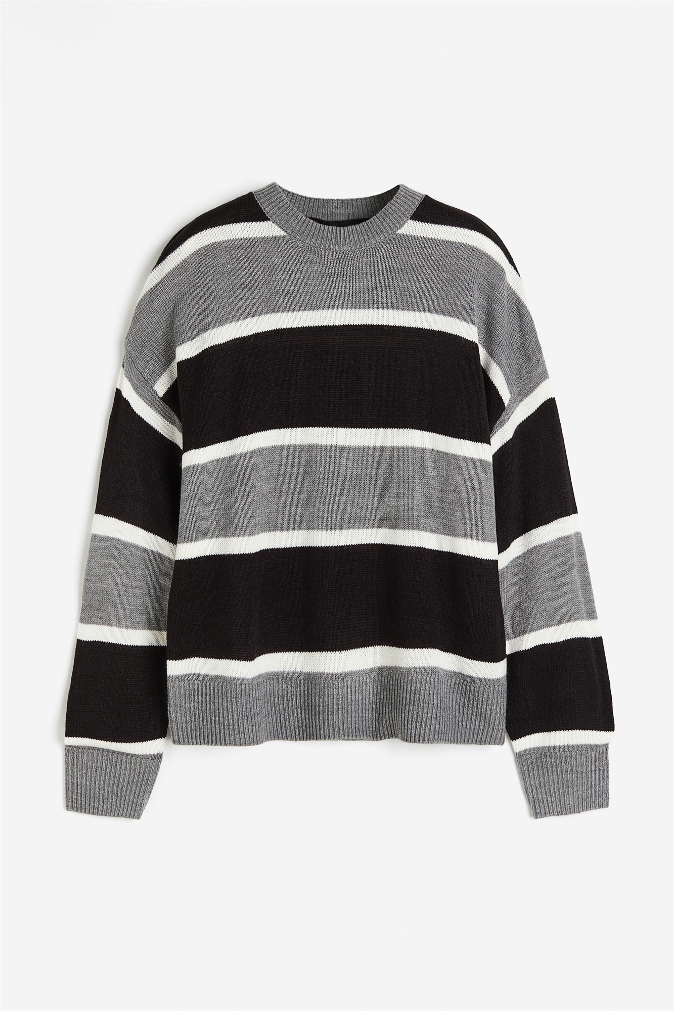 Джемпер с длинными рукавами из мягкого жаккардового трикотажа с круглым вырезом в рубчик и сильно спущенными плечами. Свободный крой. Ребристые манжеты и подол.
