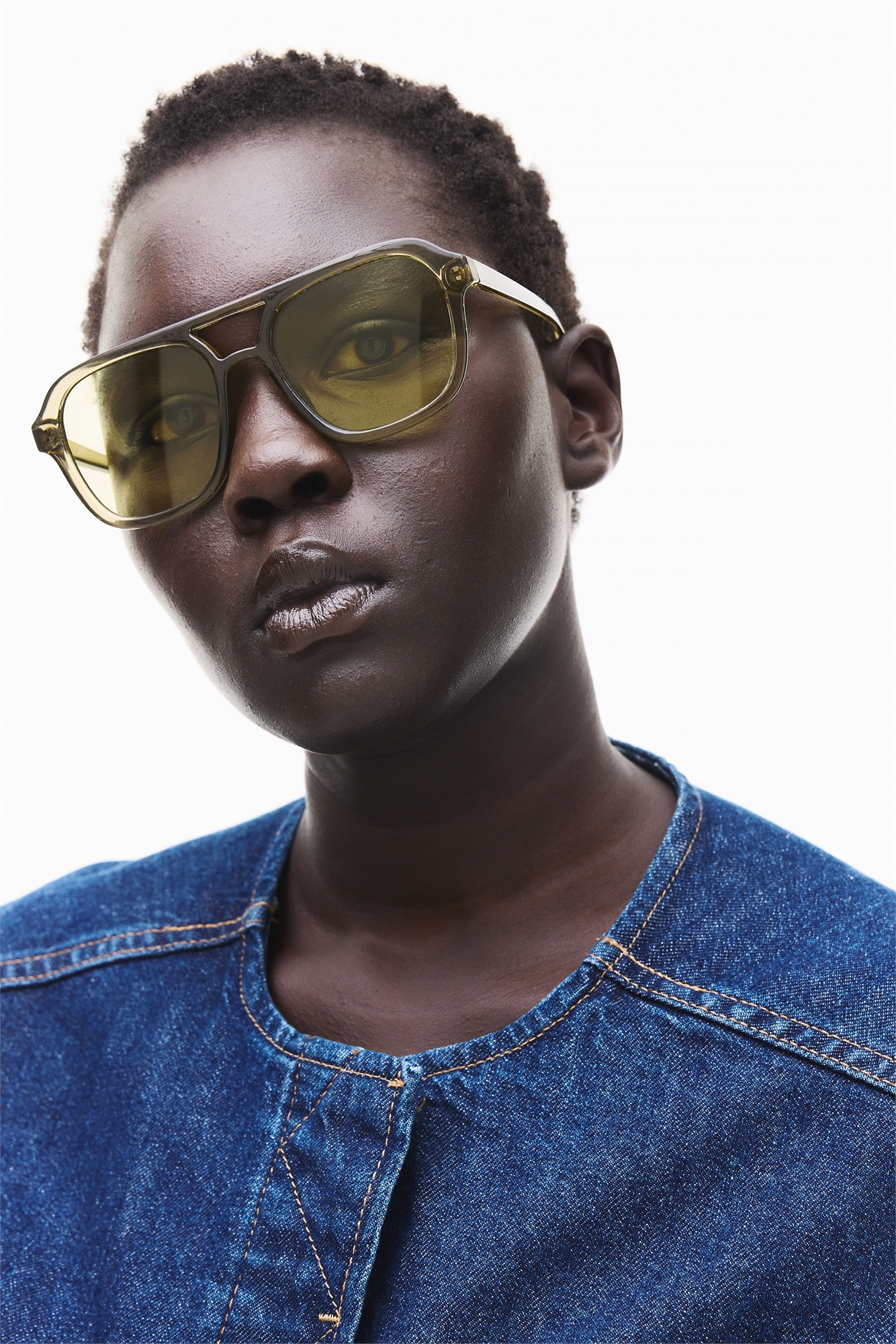 Солнцезащитные очки с пластиковой оправой и тонированными линзами из пластика с защитой от ультрафиолета.