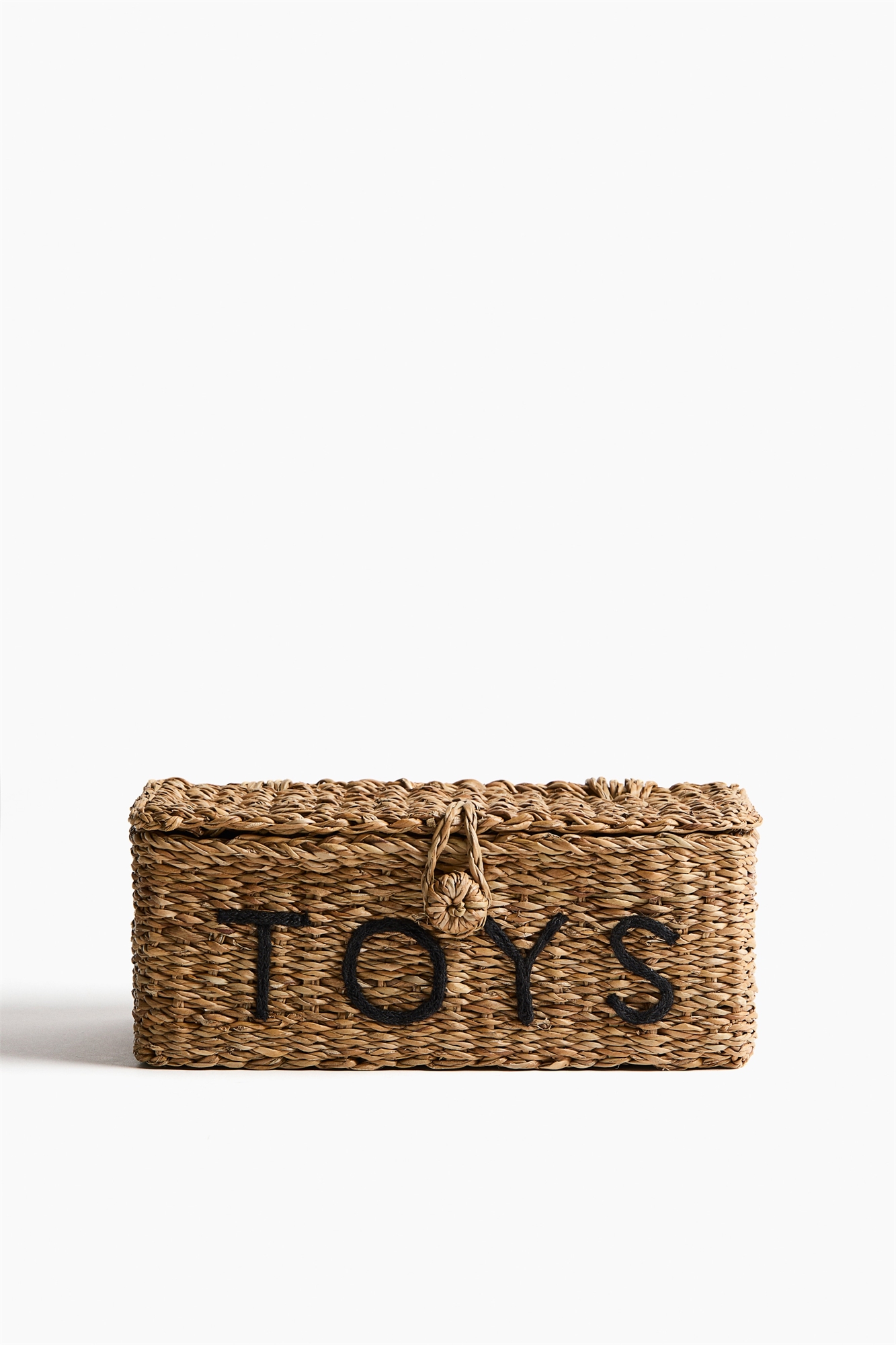 Небольшой ящик из плетеной морской травы для хранения игрушек, когда они не используются. Вышитый текстовый мотив на лицевой стороне и крышка сверху с застежкой на пуговицу и петлю. Общая высота 13 см. Ширина 23 см. Длина 32 см.