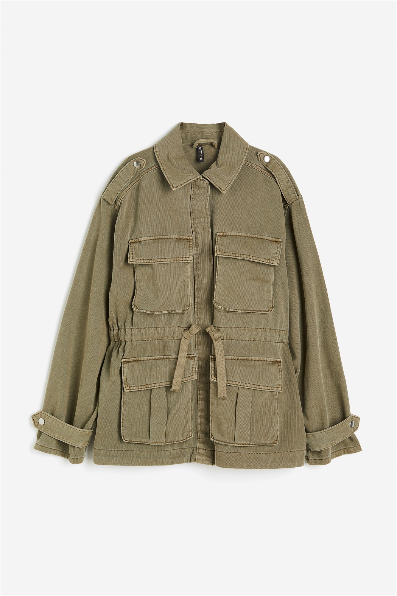 Свободная куртка свободного кроя из хлопковой саржи с воротником, потайными кнопками спереди и передом. Спущенные плечи, вставки на плечах и манжеты с застежкой на кнопки. Утягивающий шнурок на талии, нагрудные и передние карманы. Без подкладки.