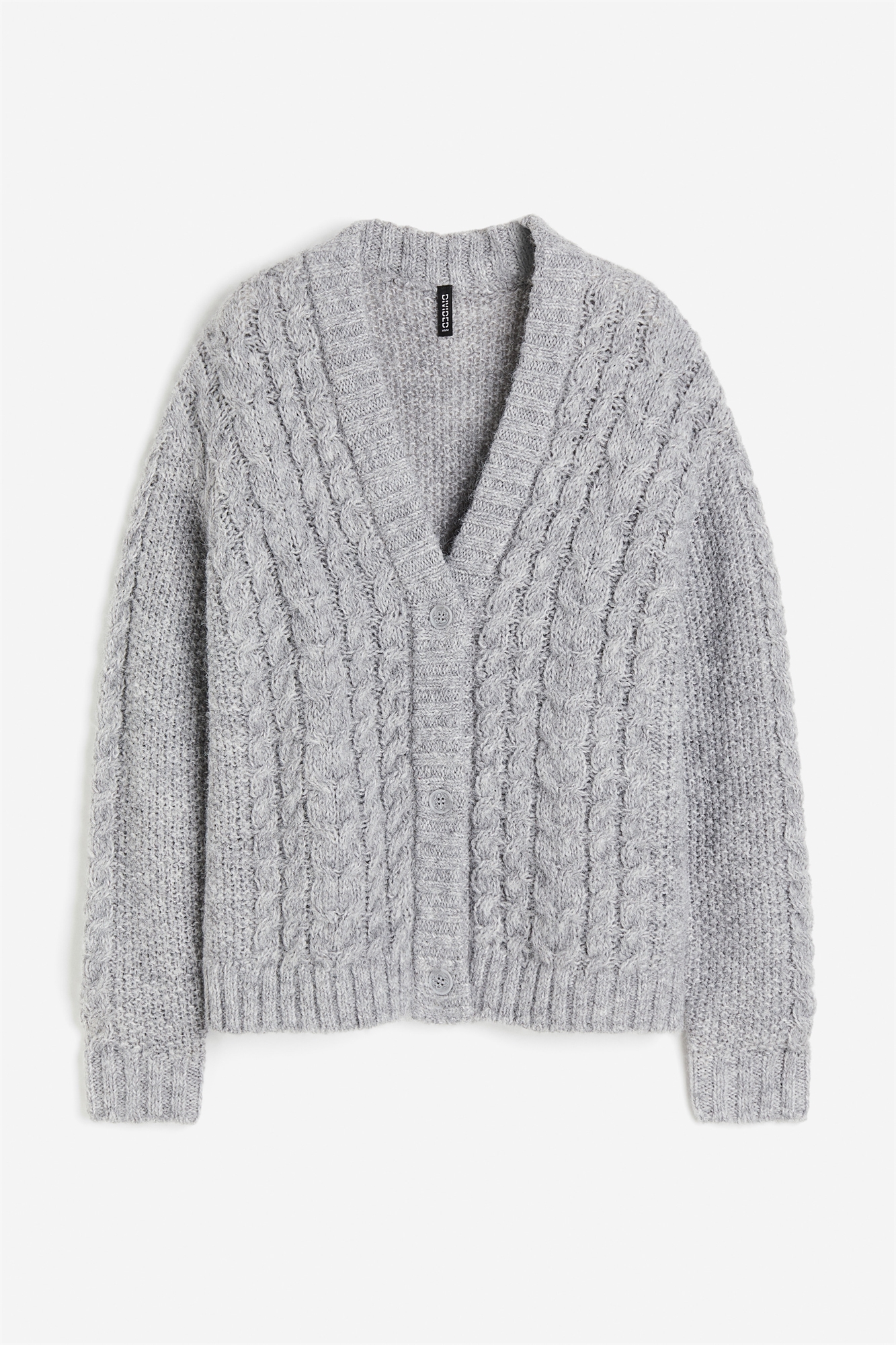 Кардиган из мягкого трикотажа с V-образным вырезом, пуговицами спереди, спущенными плечами и длинными рукавами. Окантовка вокруг выреза, по краю пуговиц, на манжетах и подоле.