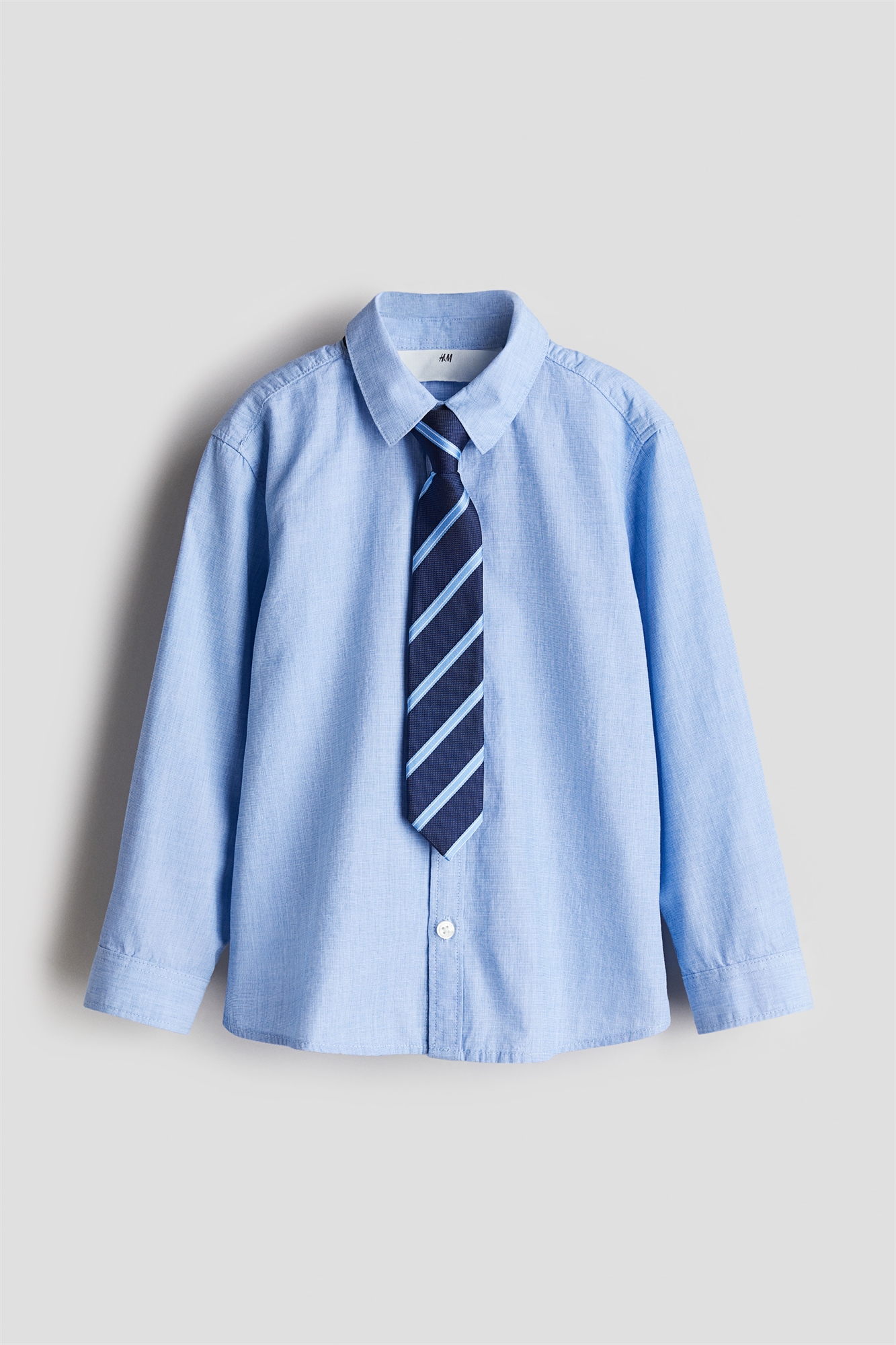 Рубашка с длинными рукавами из хлопкового полотна и галстук. Рубашка с отложным воротником, застежкой на пуговицы спереди, двухслойным ярмом сзади и манжетами на пуговицах. Съемный галстук с регулируемым эластичным ремнем и пластиковой застежкой.