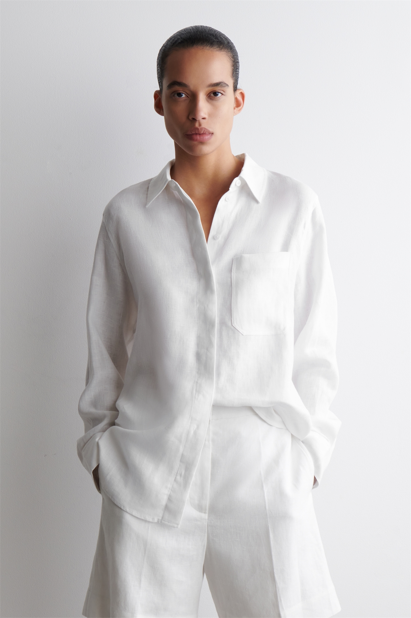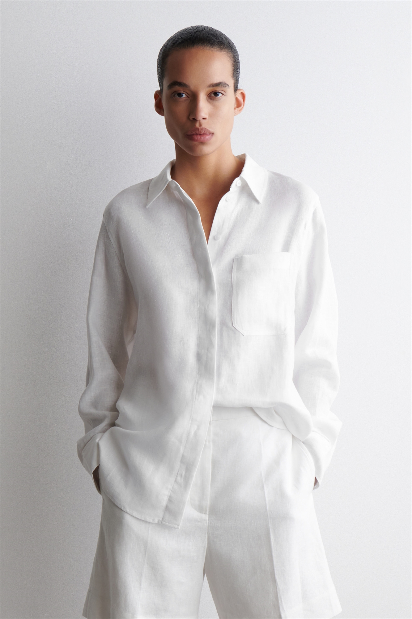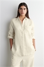Эта классическая рубашка, представленная в свежем белом оттенке, изготовлена из чистого льна, который обладает воздухопроницаемостью, легкостью и естественной текстурой. Она сшита в стиле оверсайз, который идеально подходит для ношения поверх танкеток, когда температура повышается, и имеет заостренный воротник, накладной карман и изогнутый ступенчатый подол. Сочетайте его с соответствующими брюками или выбирайте рубашку с коротким рукавом в погожие дни. Застежка на пуговицы Переработанный лен изготавливается из отходов прядильного производства или отходов раскроя ткани в процессе производства. Отходы механически перерабатываются и прядутся в новую пряжу Состав: 70% лен, 30% переработанный лен. Без учета отделки / Машинная стирка Длина по спинке для размера EU 36 составляет 78 см / Модель носит размер EU 36