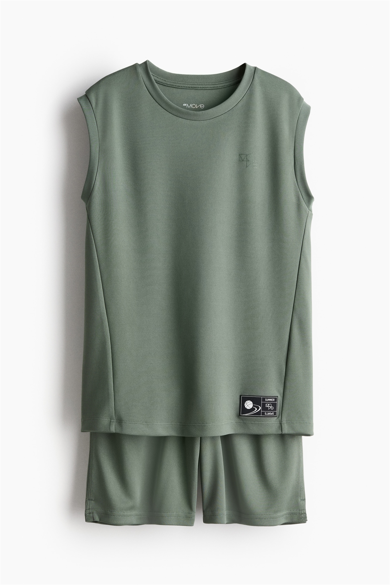 Спортивный комплект, состоящий из жилета и шорт из функциональной сетки DryMove™, которая отводит влагу от кожи, обеспечивая комфортную сухость во время движения. Жилет с боковыми швами спереди, вентиляционными отверстиями под проймами и текстовым рисунком на груди. Ребристая отделка по вырезу горловины и проймам. Шорты с эластичной отделкой и утягивающим шнурком на талии. Небольшой разрез с каждой стороны по подолу.