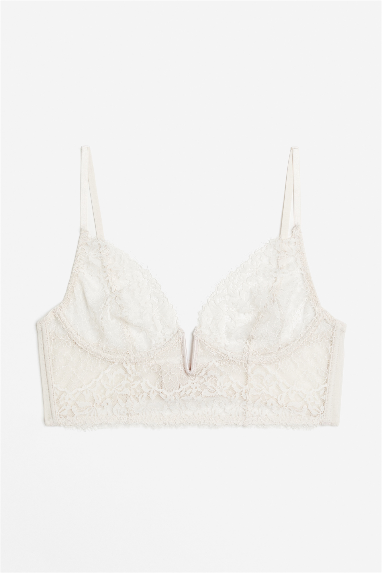 Кружевное бюстье без подкладки с заниженными чашечками из сетки, придающими бюсту естественную форму и обеспечивающими легкую поддержку. Регулируемые бретели и широкая застежка-крючок сзади.