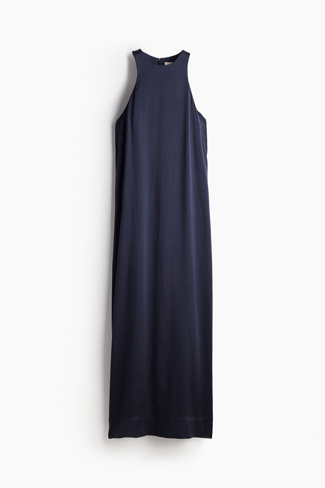 Платье А-силуэт без рукавов длиной до щиколоток из мягко драпирующегося блестящего шелка. Узкий крой в верхней части с круглым вырезом и потайной застежкой-молнией у горловины. На подкладке.