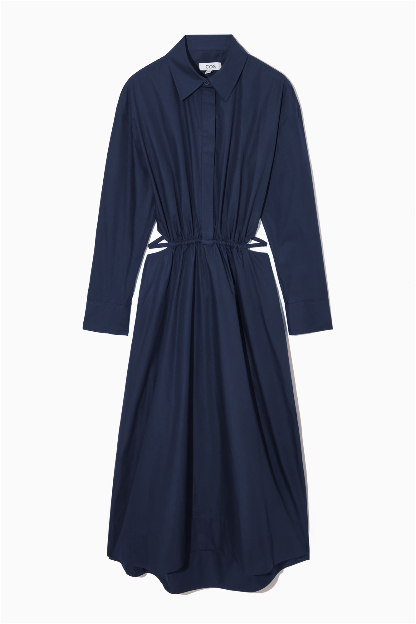 С этим платьем в вашем гардеробе вам не придется ломать голову над тем, что надеть на летние мероприятия. Изготовленное из хлопкового поплина темно-синего оттенка, оно имеет вырезы на талии и застегивается на элегантные завязки на открытой спине. Носите его с мюлями на каблуке и одной из наших фирменных сумок. - Свободный крой - Заостренный воротник, длинные рукава с манжетами - Боковые разрезы, складки сзади 100% хлопок / Машинная стирка Длина по спинке размера EU 36 составляет 127,5 см, длина рукава - 54,5 см / Модель носит размер EU 36