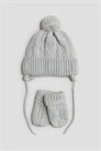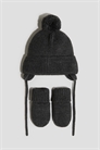 Комплект на флисовой подкладке, состоящий из пинетки и варежек из мягкого трикотажа. Пинетки с помпоном на макушке, ребристым, подвернутым подолом, ушанкой и завязками под подбородком. Варежки с ребристыми манжетами. Размеры 0-2M и 2-6M без больших пальцев.