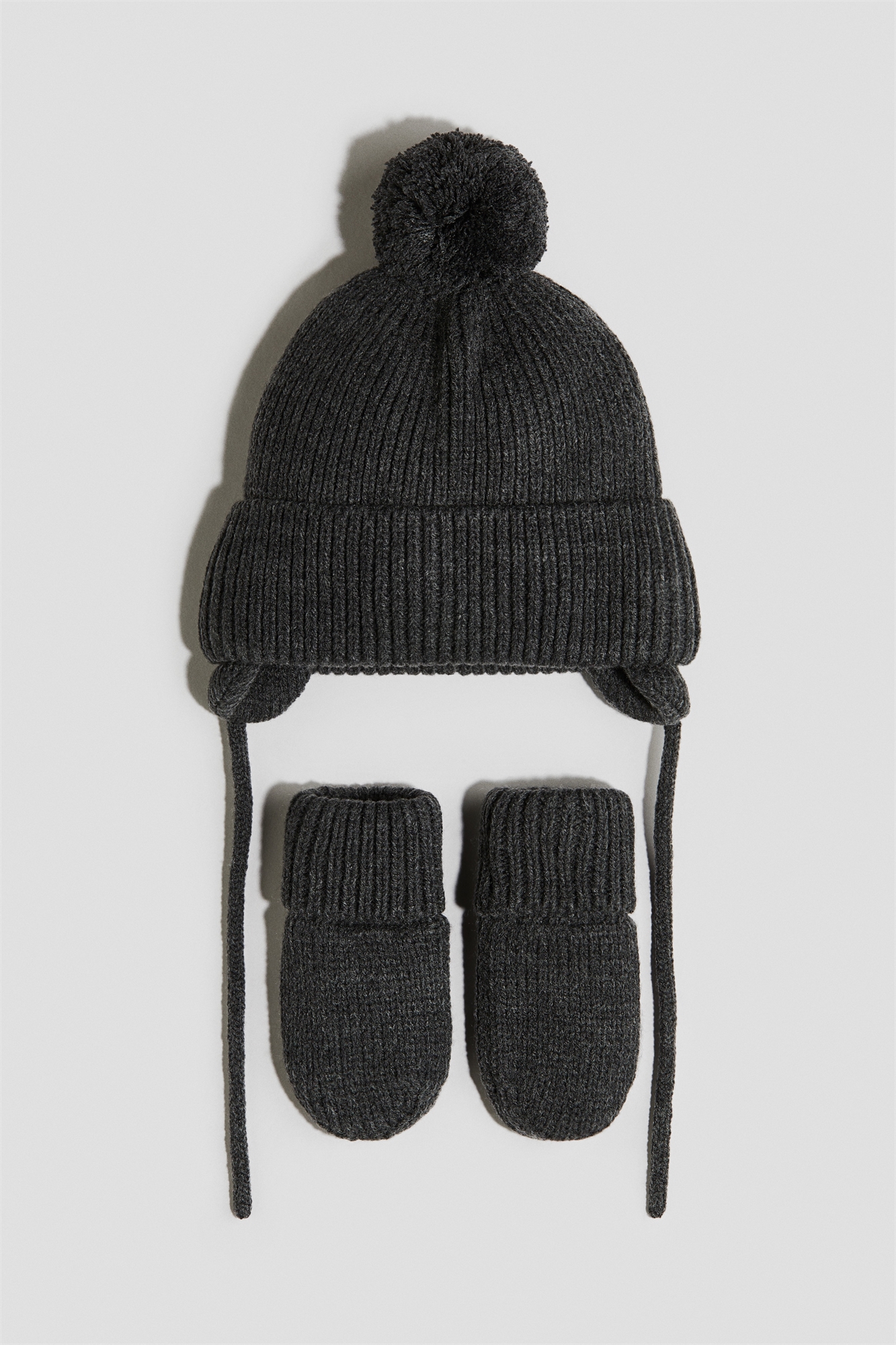 Комплект на флисовой подкладке, состоящий из пинетки и варежек из мягкого трикотажа. Пинетки с помпоном на макушке, ребристым, подвернутым подолом, ушанкой и завязками под подбородком. Варежки с ребристыми манжетами. Размеры 0-2M и 2-6M без больших пальцев.