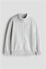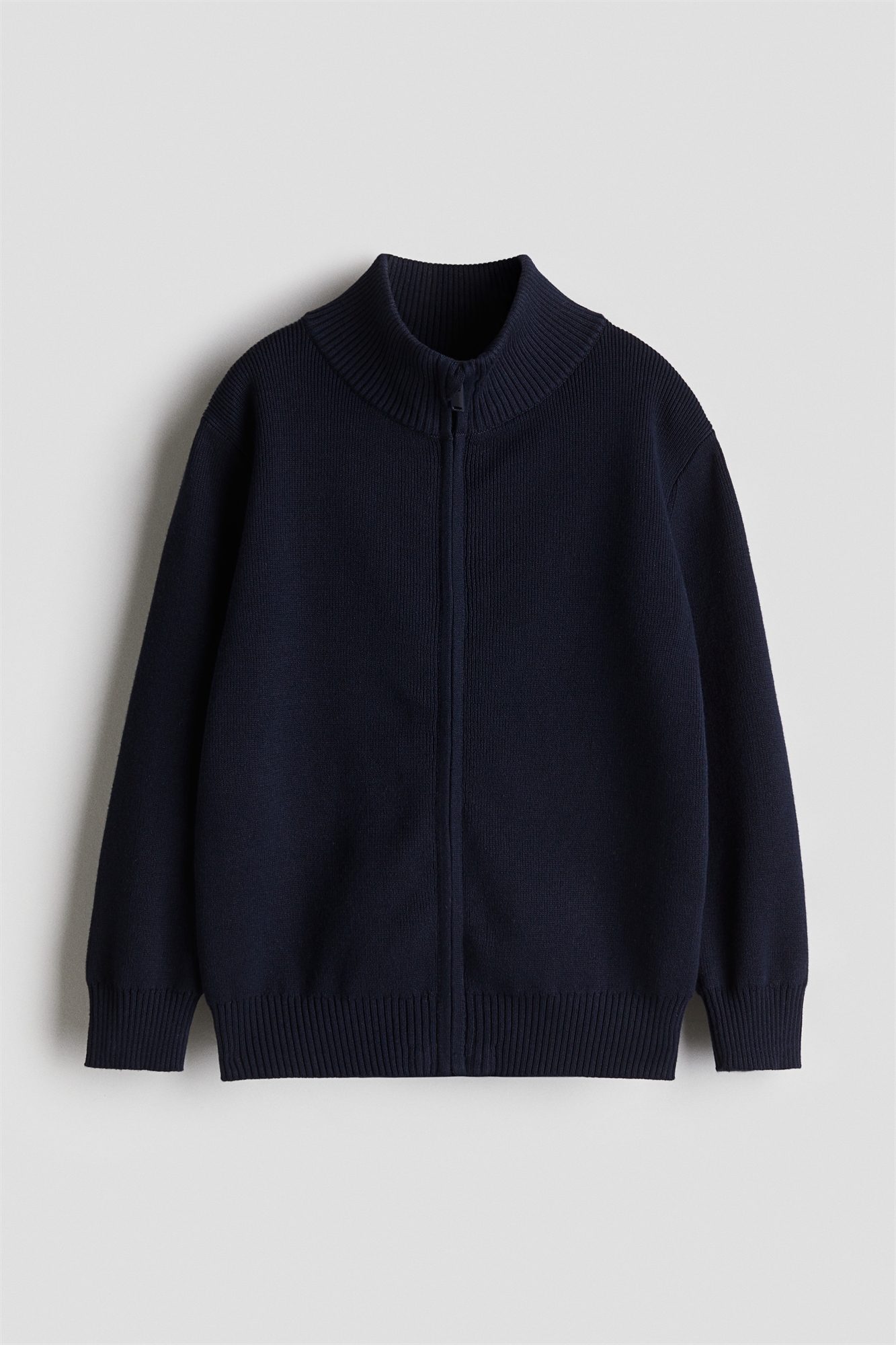 Свободный кардиган из мягкого трикотажа с высоким ребристым воротником, застежкой-молнией спереди, спущенными плечами, длинными рукавами и окантовкой манжет и подола.