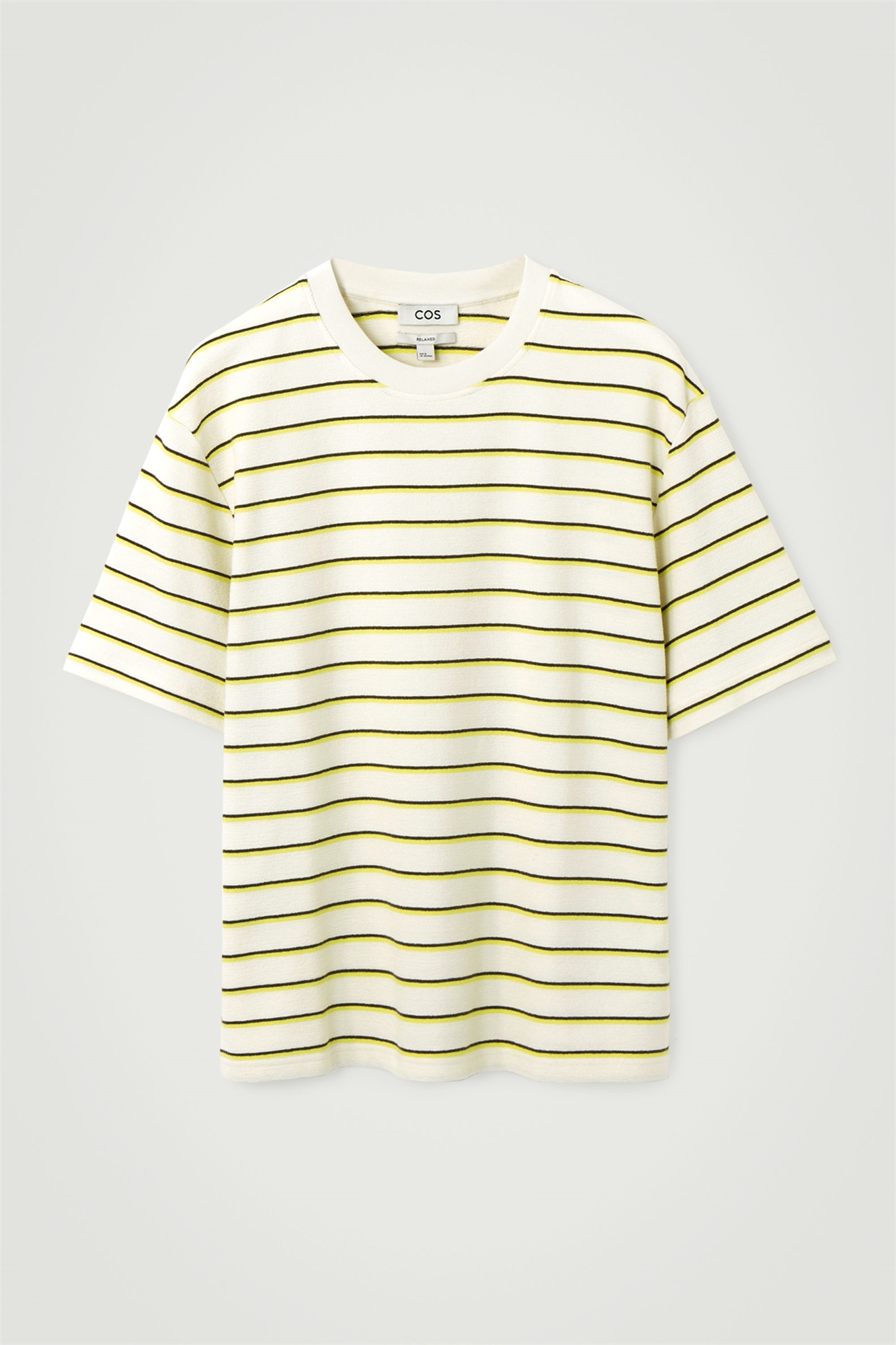Полосатая футболка - обязательный элемент любого современного гардероба. Изготовленная из чистого хлопка с текстурой, она имеет непринужденный крой. Удобный выбор для прохлады в течение всего дня. Стиль: носите ее с джинсами, шортами или брюками - она сочетается со всем. Повседневный крой, 215 гсм Круглый вырез Короткие рукава Ткань: 100% хлопок. Без учета отделки / Машинная стирка Длина по спинке в размере M составляет 71,1 см / Модель носит размер M