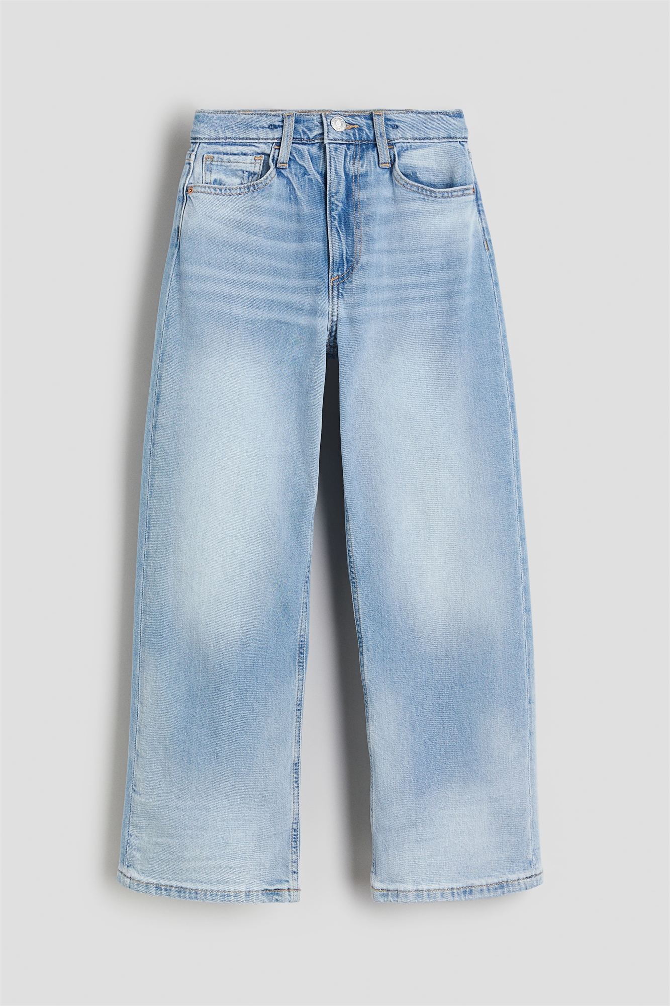 Джинсы с 5 карманами из моющегося хлопкового денима. Высокая талия с регулируемой резинкой, ширинка на молнии с пуговицей и широкие штанины.