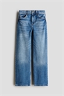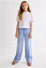 Джинсы с 5 карманами из моющегося хлопкового денима. Высокая талия с регулируемой резинкой, ширинка на молнии с пуговицей и широкие штанины.