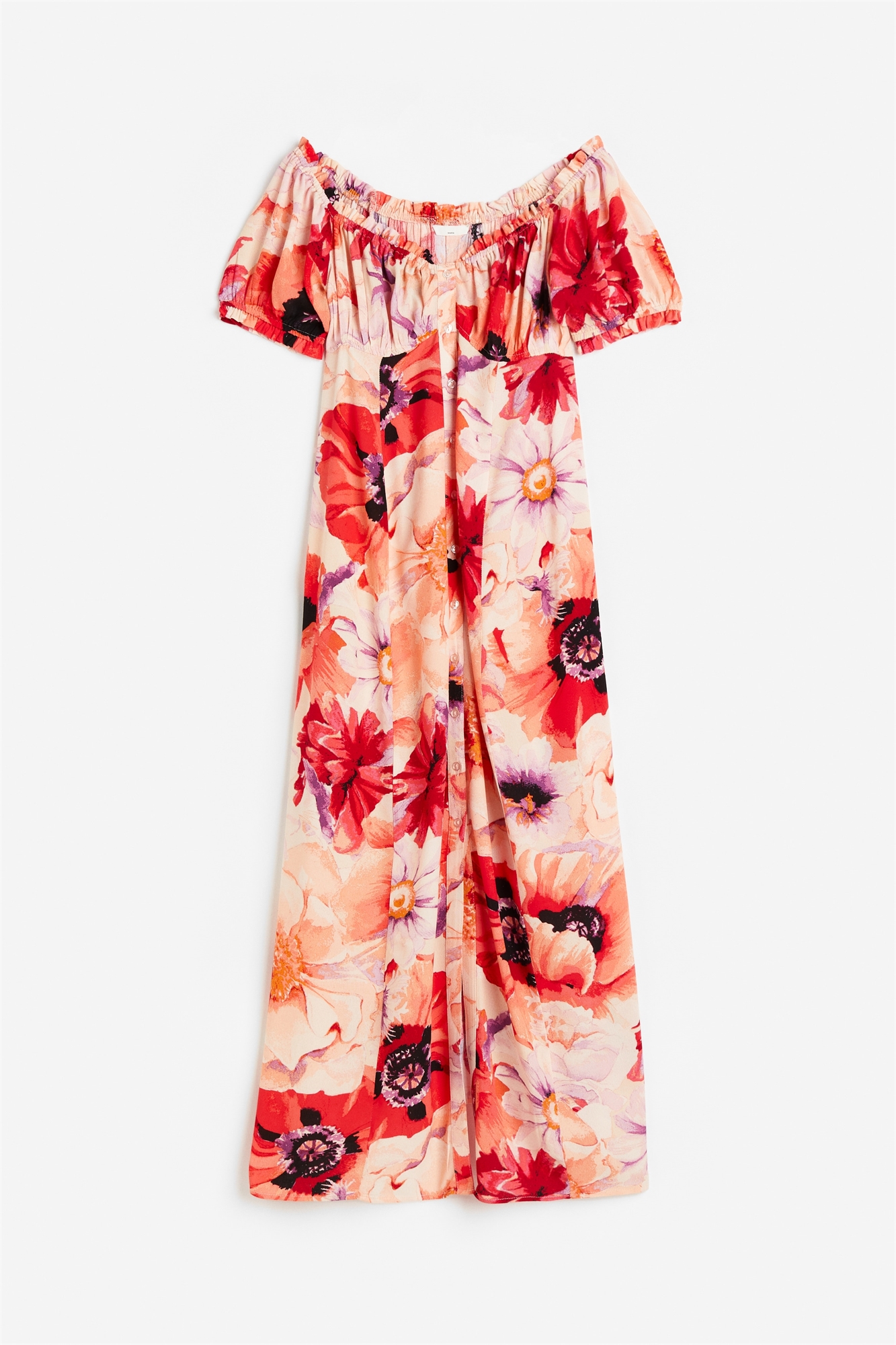 Платье длиной до колен с плечами из вискозного крепа. V-образный вырез, декоративные пуговицы спереди и короткие пышные рукава с эластичными манжетами. Эластичный шов в верхней части и шов в рубчик под бюстом для мягкой драпировки лифа. Эластичная резинка сзади и тонкие швы "принцесса" спереди и сзади. Без подкладки.