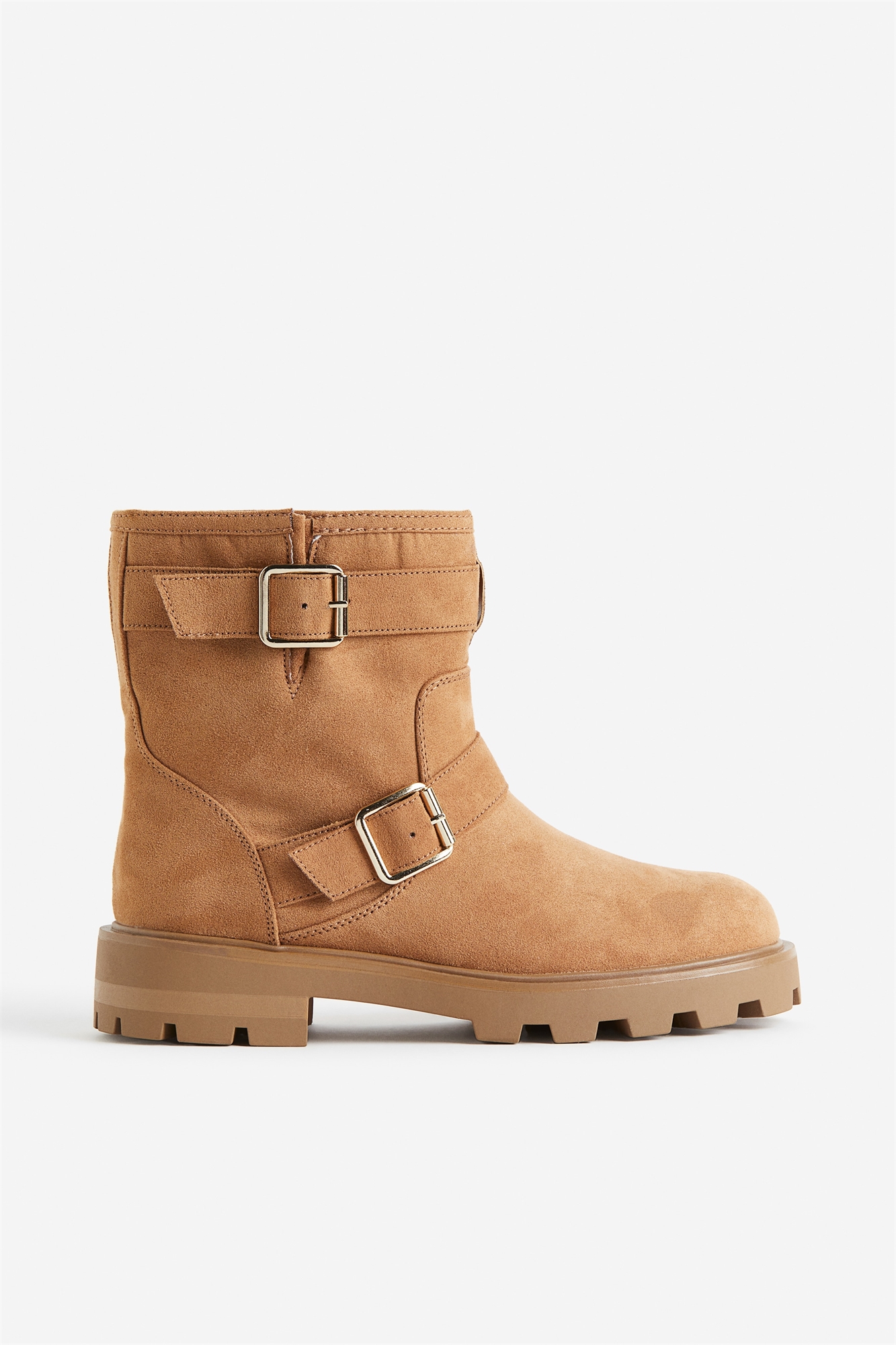 Сапоги с голенищем длиной до теленка и регулируемыми ремешками с металлической пряжкой. Подкладка из джерси и мохнатая подошва с рисунком. Высота подошвы 2 см. Каблук 4 см.