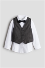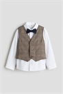 Нарядный комплект из рубашки, жилета и галстука-бабочки из тканого материала. Рубашка с воротником, передом и пуговицами сзади. Длинные рукава с втачным рукавом и манжетами на пуговицах. Жилет с накладными карманами и пуговицами спереди. Галстук-бабочка с регулируемым эластичным ремешком и пластиковой застежкой сзади.