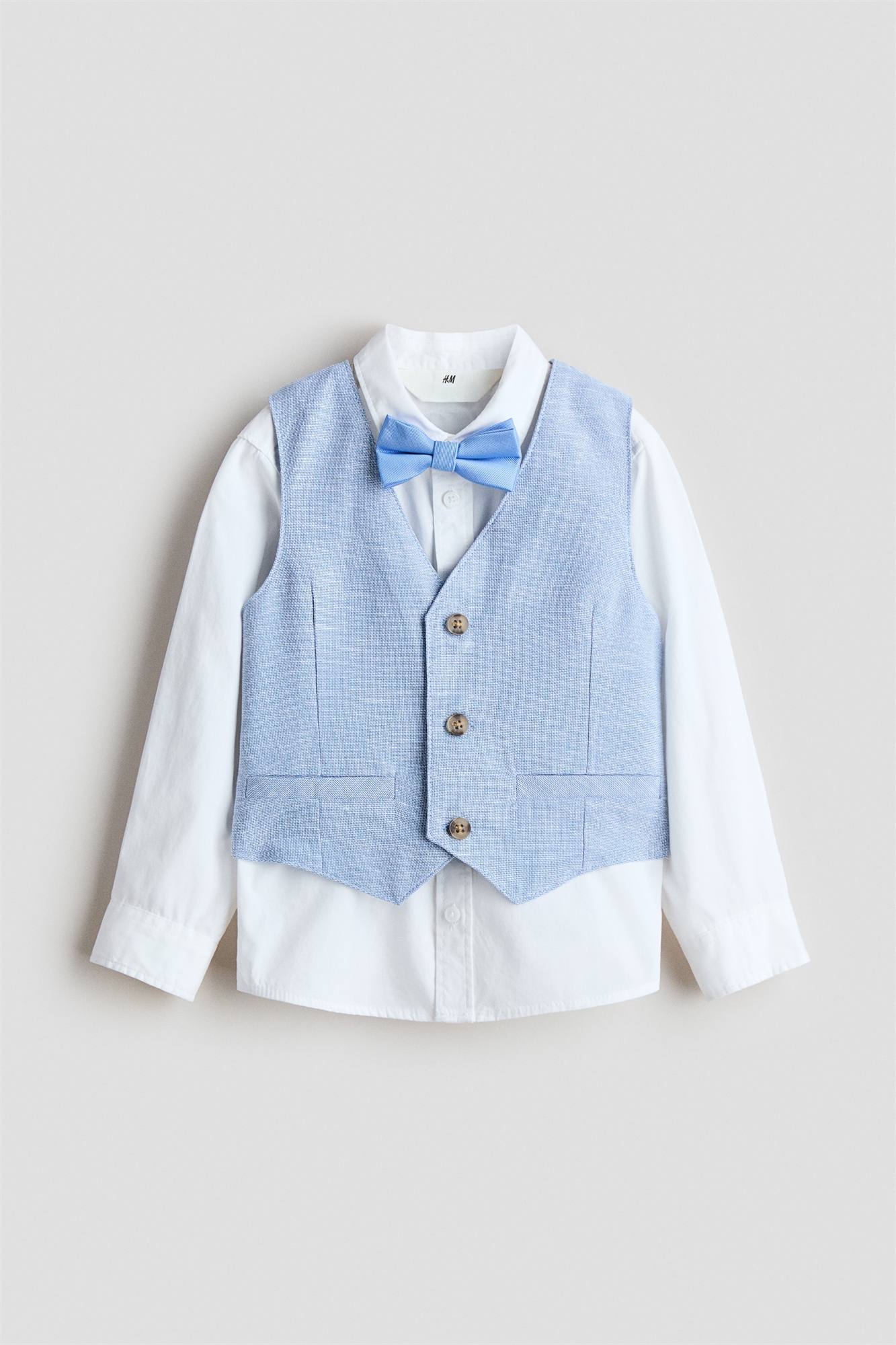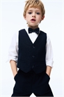 Нарядный комплект из рубашки, жилета и галстука-бабочки из тканого материала. Рубашка с воротником, передом и пуговицами сзади. Длинные рукава с втачным рукавом и манжетами на пуговицах. Жилет с накладными карманами и пуговицами спереди. Галстук-бабочка с регулируемым эластичным ремешком и пластиковой застежкой сзади.