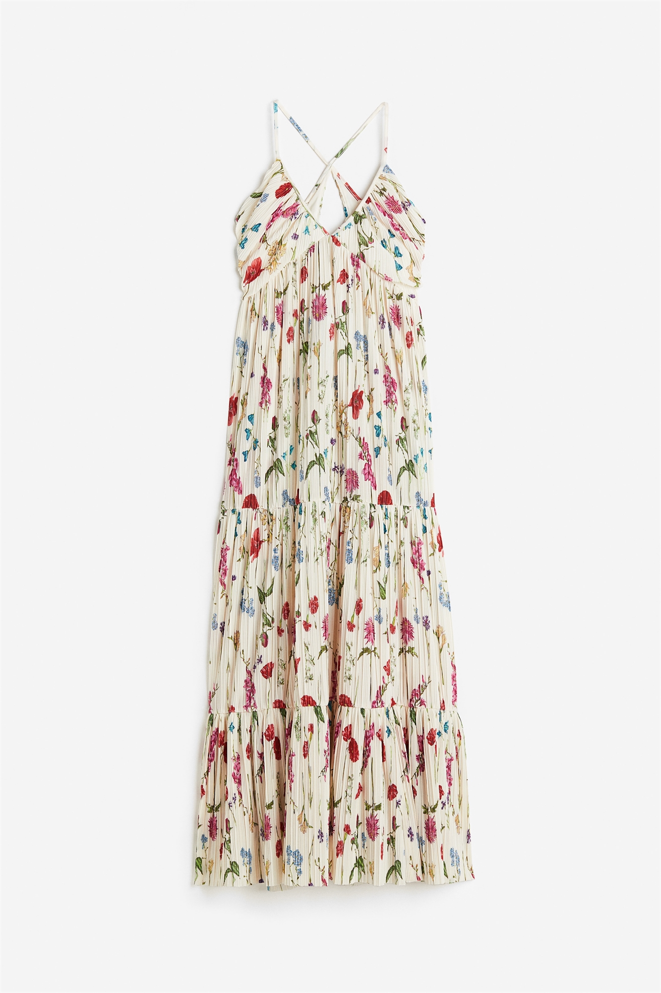 Длинное платье из плиссированного джерси с глубоким V-образным вырезом и узкими бретелями, перекрещивающимися на частично открытой спине. Сборчатый шов под бюстом и многоярусная юбка А-линии. Потайная застежка-молния с одной стороны. Подкладка в верхней части.