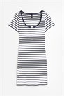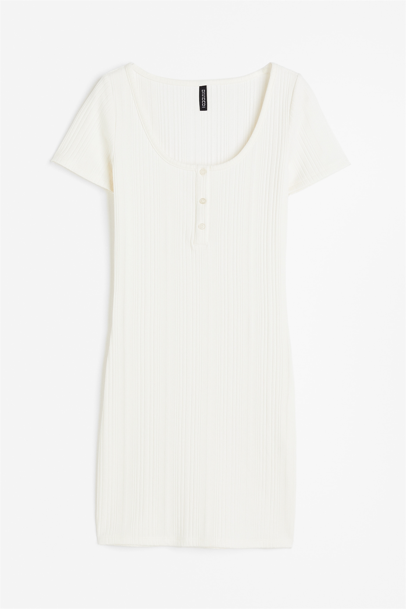 Короткое, облегающее фигуру платье из ребристого джерси с глубоким круглым вырезом и декоративной застежкой на пуговицы. Длинные рукава и прямой подол.