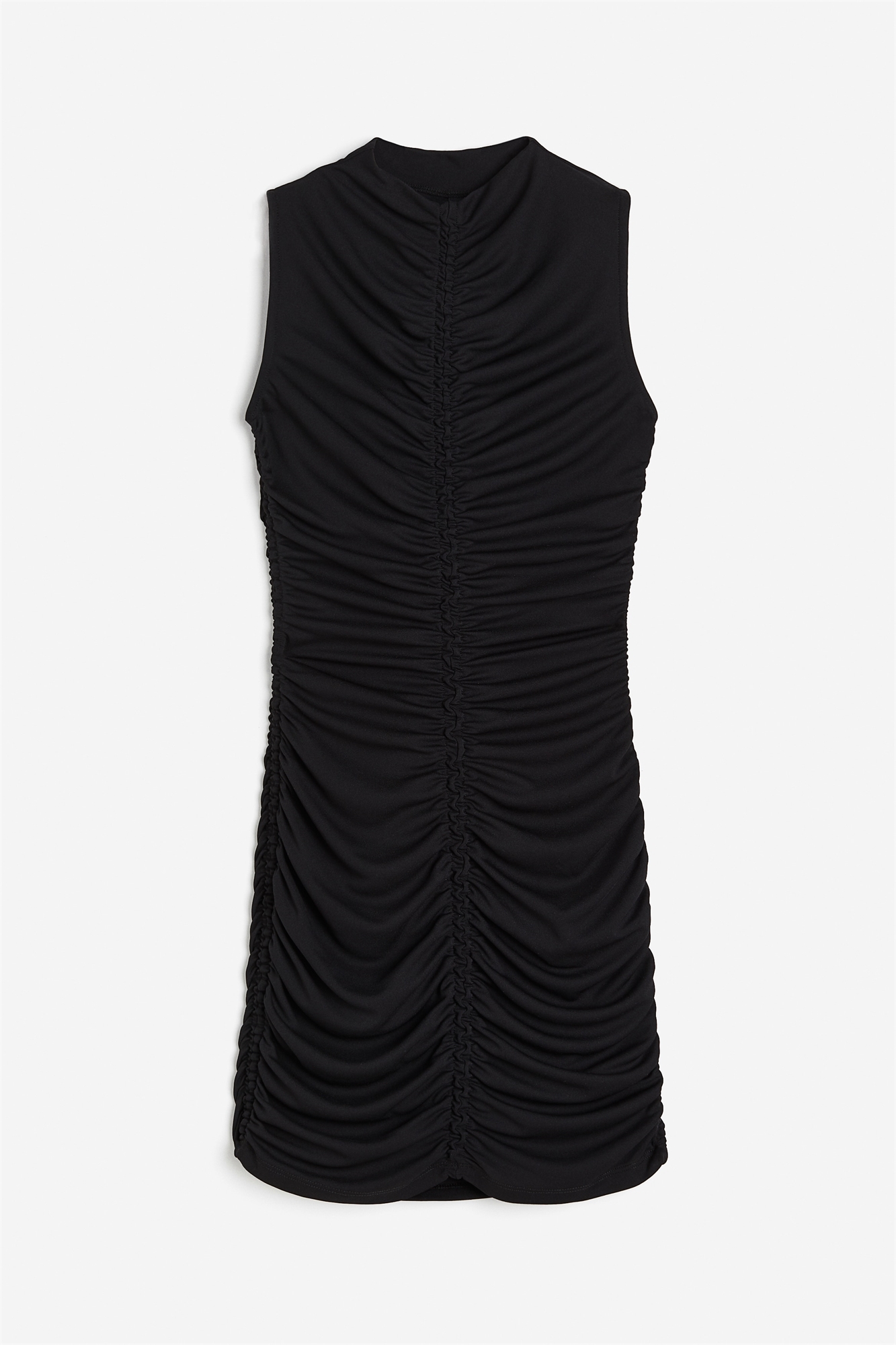 Короткое приталенное платье без рукавов из джерси с воротником-стойкой и сборками по переду и бокам, создающими эффект легкой драпировки.