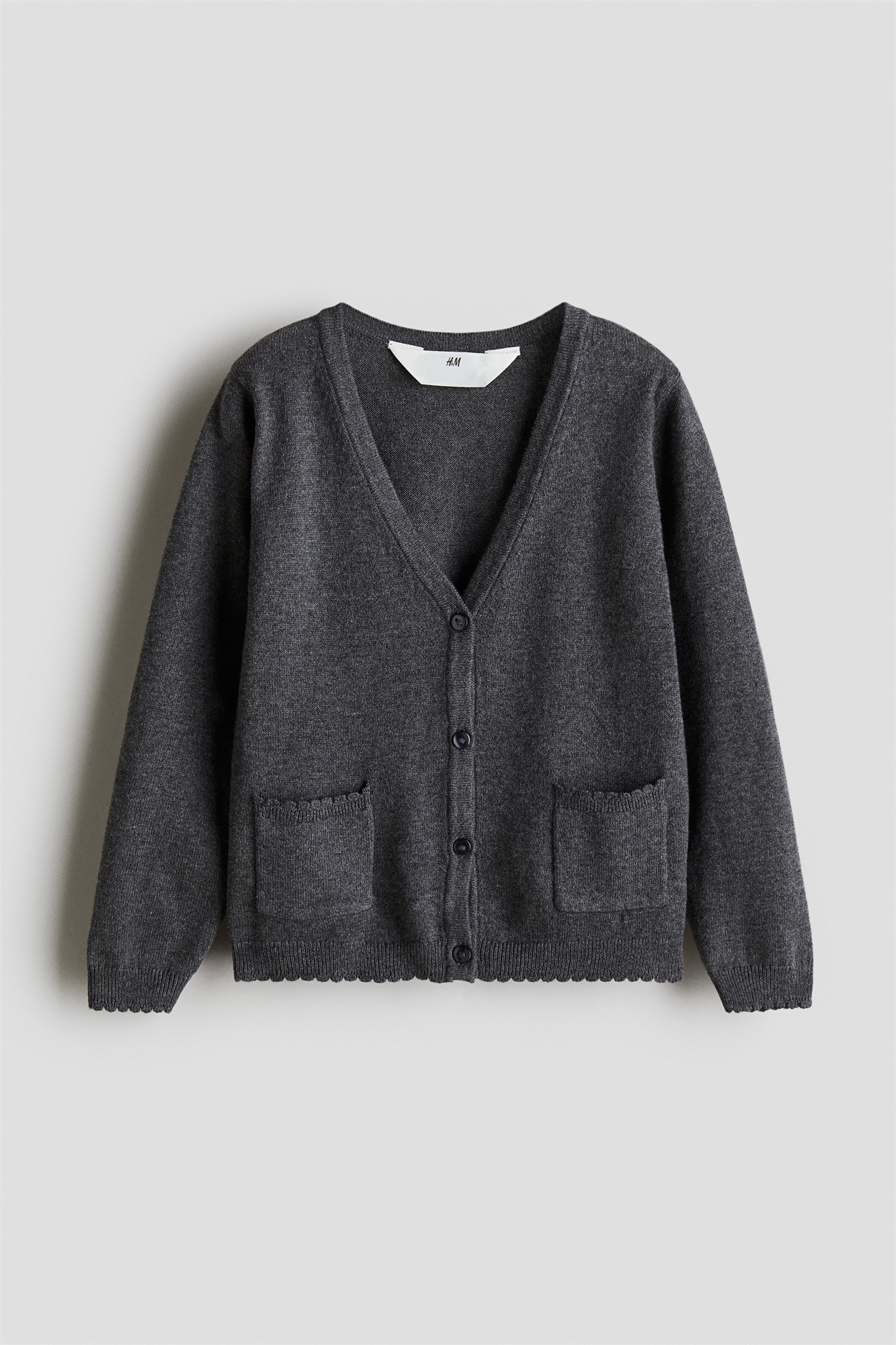 Школьный кардиган с длинными рукавами из мягкого хлопка тонкой вязки. V-образный вырез, пуговицы спереди и открытые передние карманы. Манжеты и подол отделаны гребешком.
