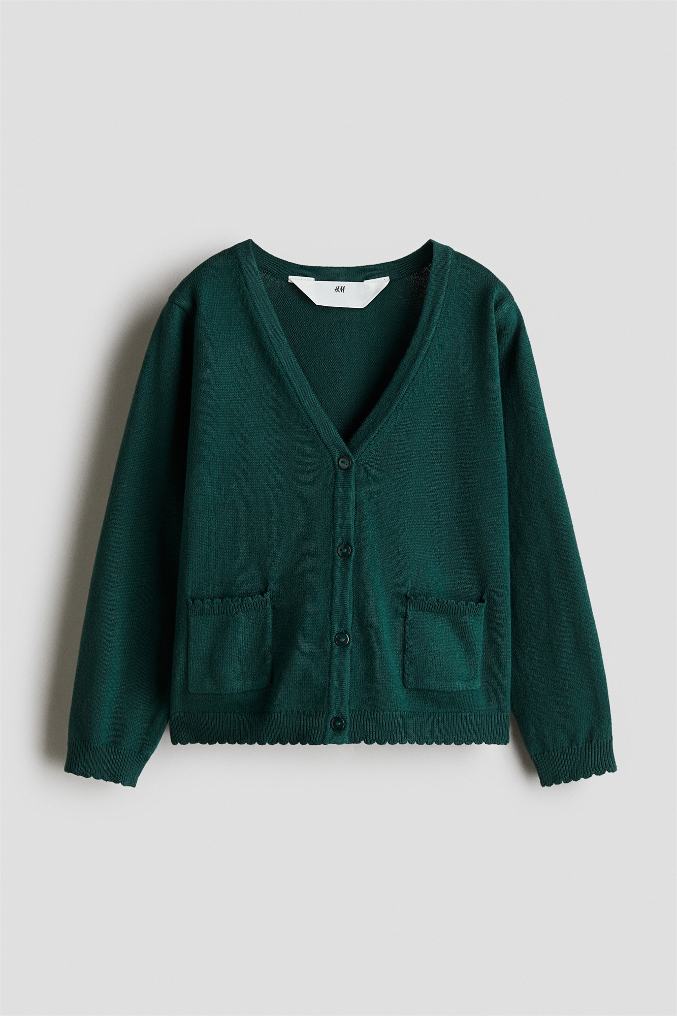 Школьный кардиган с длинными рукавами из мягкого хлопка тонкой вязки. V-образный вырез, пуговицы спереди и открытые передние карманы. Манжеты и подол отделаны гребешком.