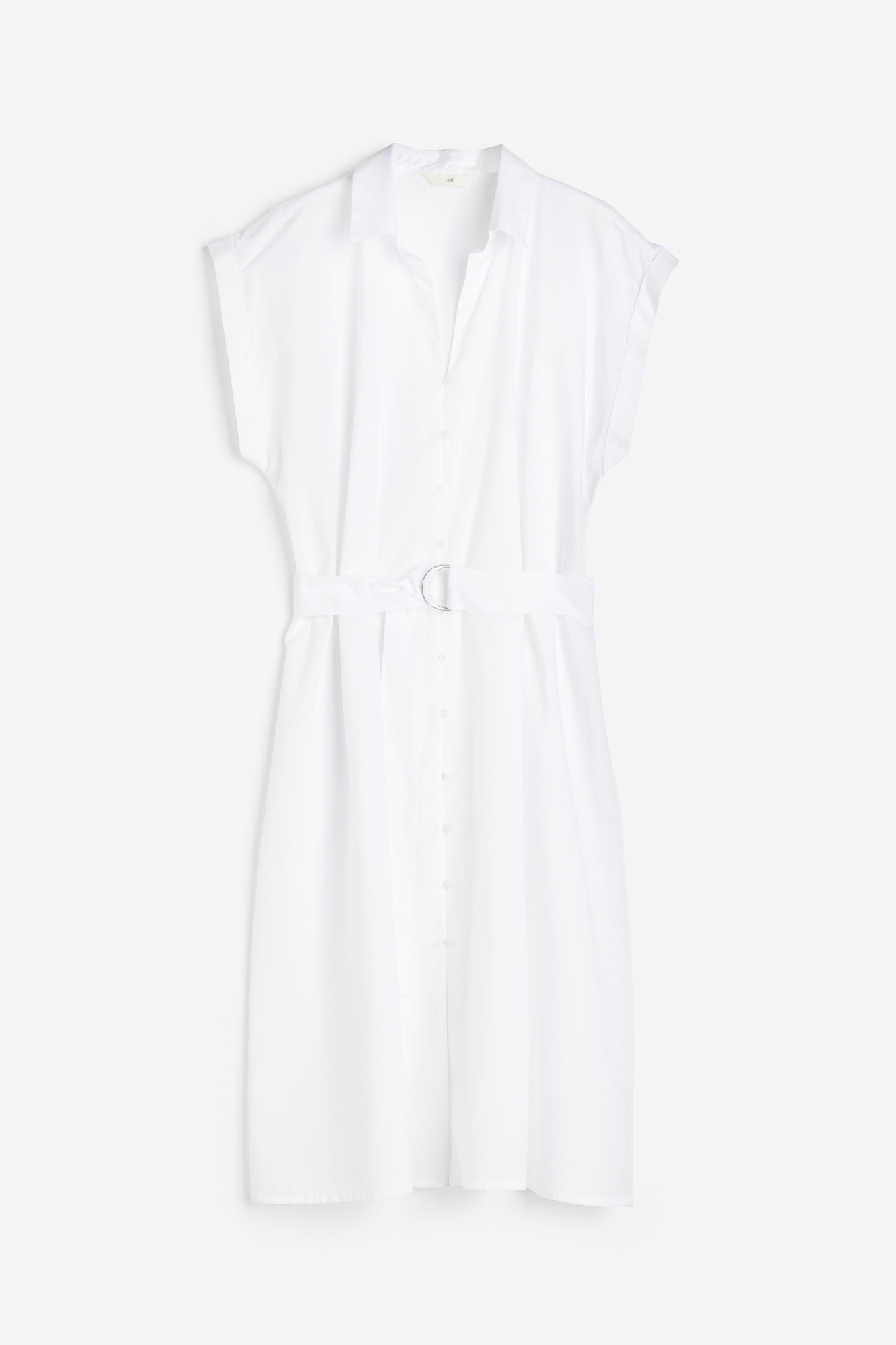 Платье-рубашка длиной до колен из воздушного хлопкового полотна с воротником, V-образной проймой и пуговицами спереди. Свободный крой, короткие рукава с вшитыми оборочками, съемный пояс на талии и прямой подол. Без подкладки.