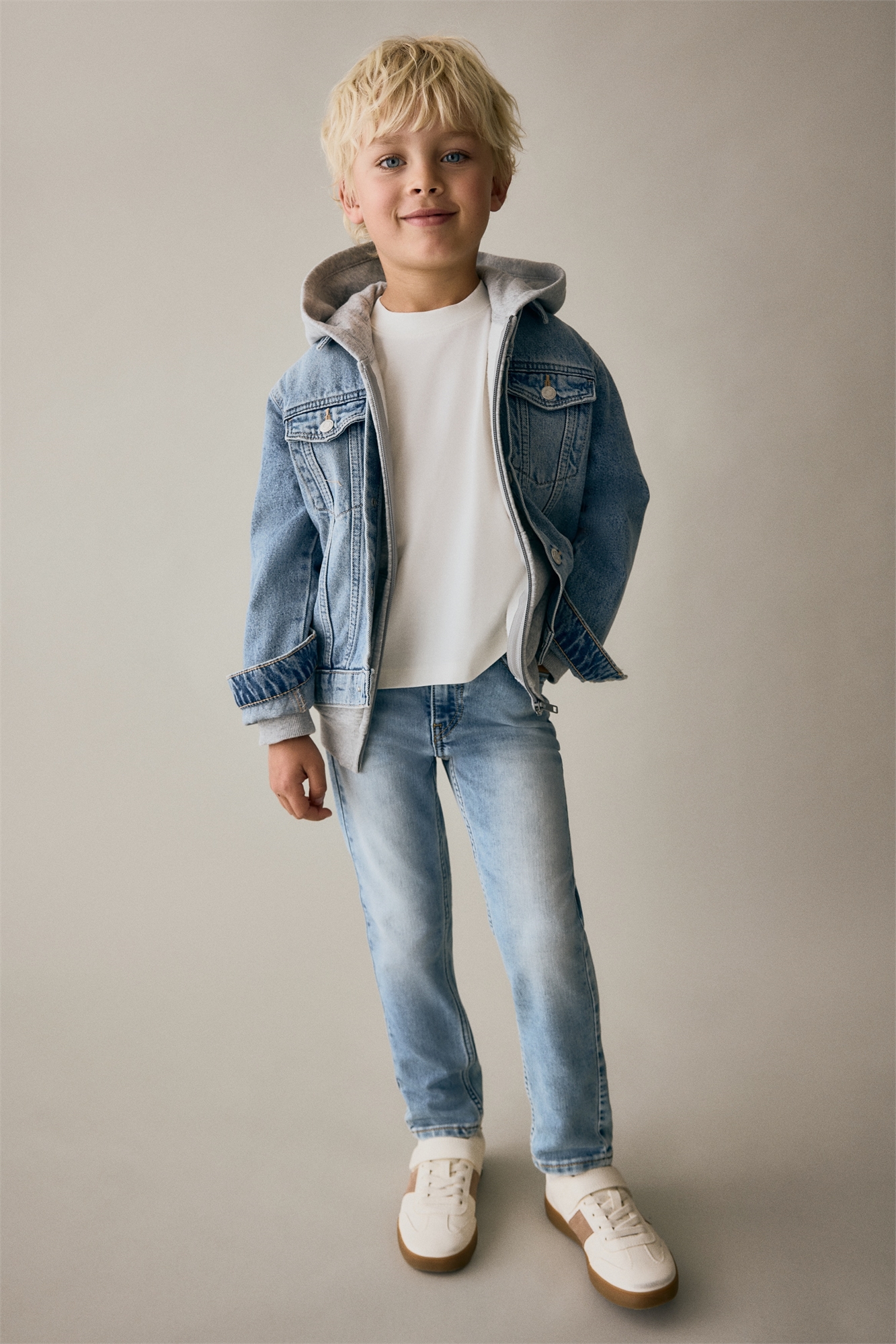 Джинсы из эластичного, супермягкого денима с зауженной посадкой по бедрам, ляжкам и штанинам. Регулируемая резинка на талии, ширинка на молнии и пуговице, передние и задние карманы.