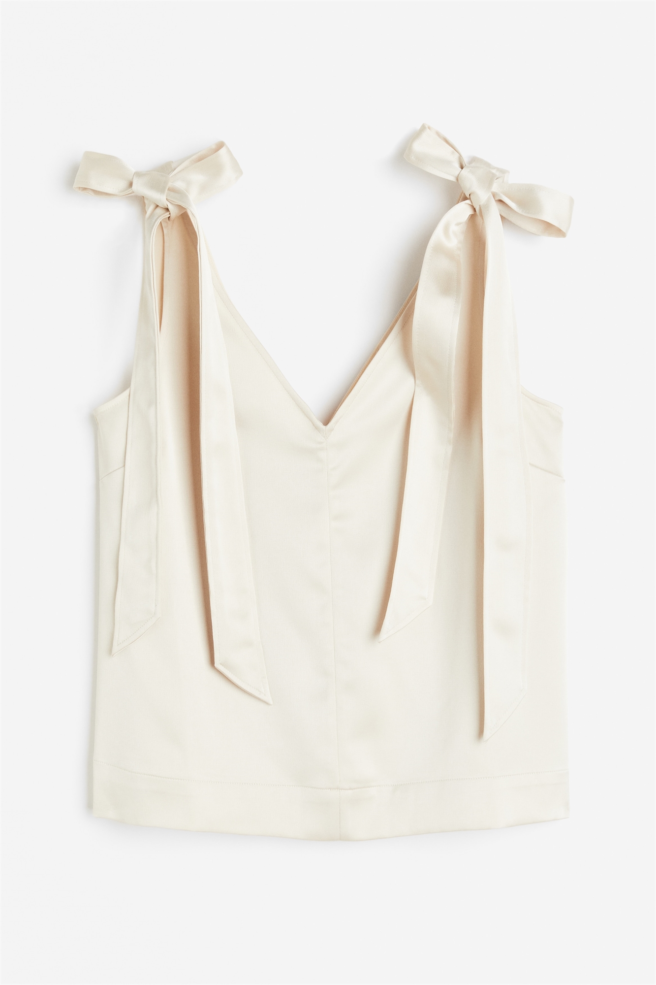 Облегающий топ из тканого материала с глубоким V-образным вырезом и широкими завязывающимися бретелями. Вытачки на груди и видимый шов спереди и сзади.
