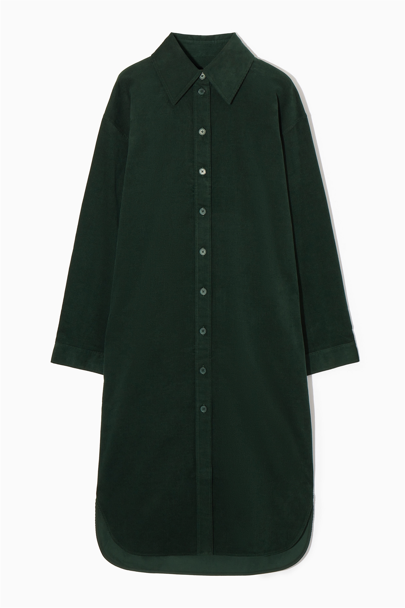Это изумрудно-зеленое платье-миди - современный взгляд нашей команды дизайнеров на классическое платье-рубашку. Оно сшито из тонко выделанного, тактильно приятного хлопка-вельвета и имеет острый заостренный воротник, тональные пуговицы и пару карманов в боковых швах. Застежка на пуговицы Длинные рукава со складками, карманы в боковых швах 100% хлопок / Машинная стирка Длина по спинке для размера EU 36 составляет 113,5 см / Модель носит размер EU 36