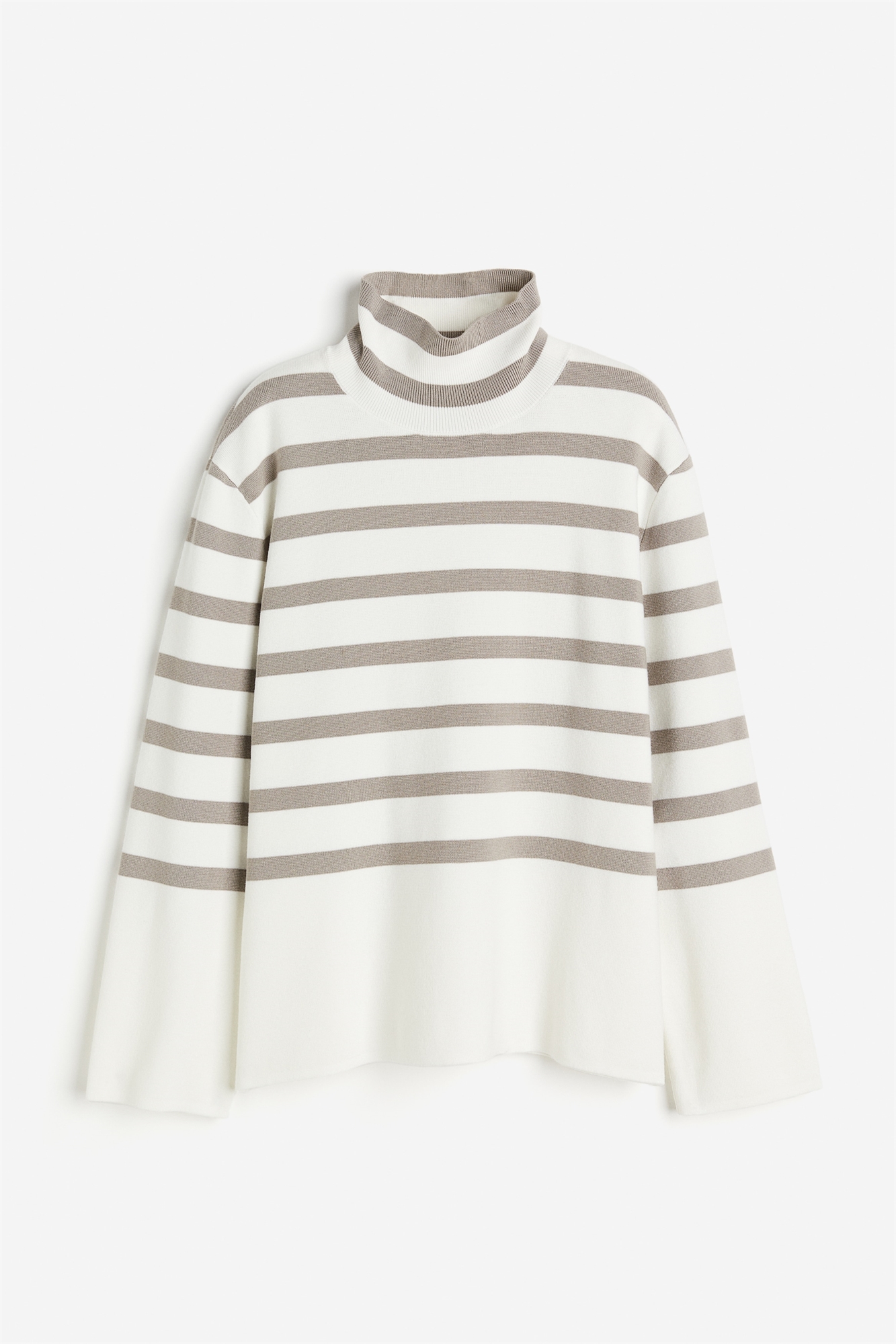 Джемпер с длинными рукавами из тонкого трикотажа, с горловиной в виде черепахи и прямым подолом с разрезом с каждой стороны.