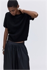 Джемпер из мягкого тонкого трикотажа с круглым вырезом и короткими рукавами. Окантовка по вырезу горловины, манжетам и подолу.
