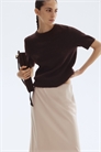 Джемпер из мягкого тонкого трикотажа с круглым вырезом и короткими рукавами. Окантовка по вырезу горловины, манжетам и подолу.