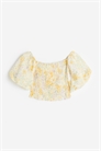 Обрезанный топ без плеч из тканого материала из смеси вискозы. Лиф с отделкой мокасинами и короткие двухслойные рукава-баллоны с узкой резинкой на манжетах.