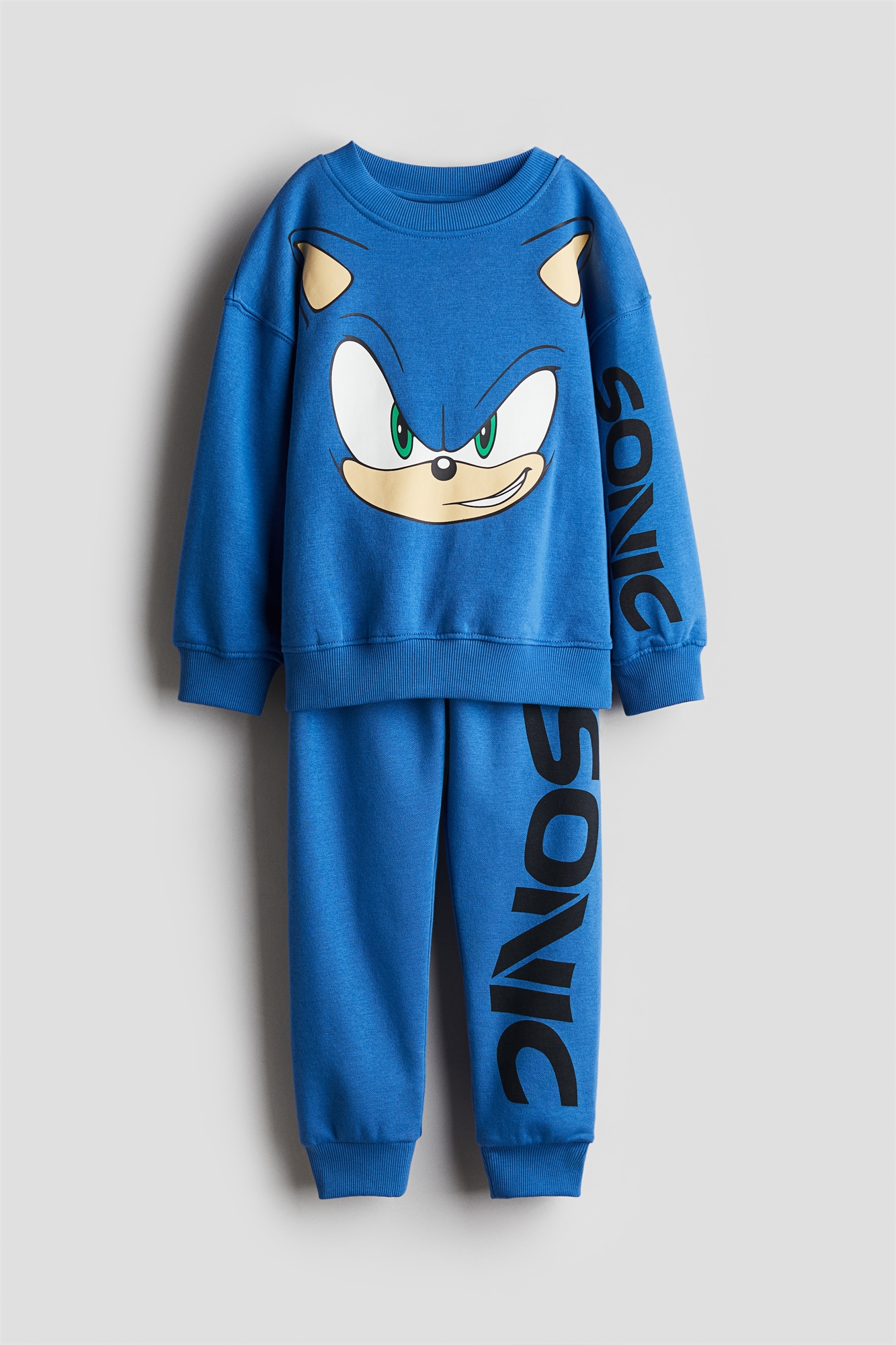 Комплект из топа и пары джоггеров из принтованной толстовки с мягким начесом внутри. Топ с круглым вырезом в рубчик, спущенными плечами, длинными рукавами, манжетами и подолом в рубчик. Джоггеры с эластичным утягивающим поясом и тесемками по подолу.