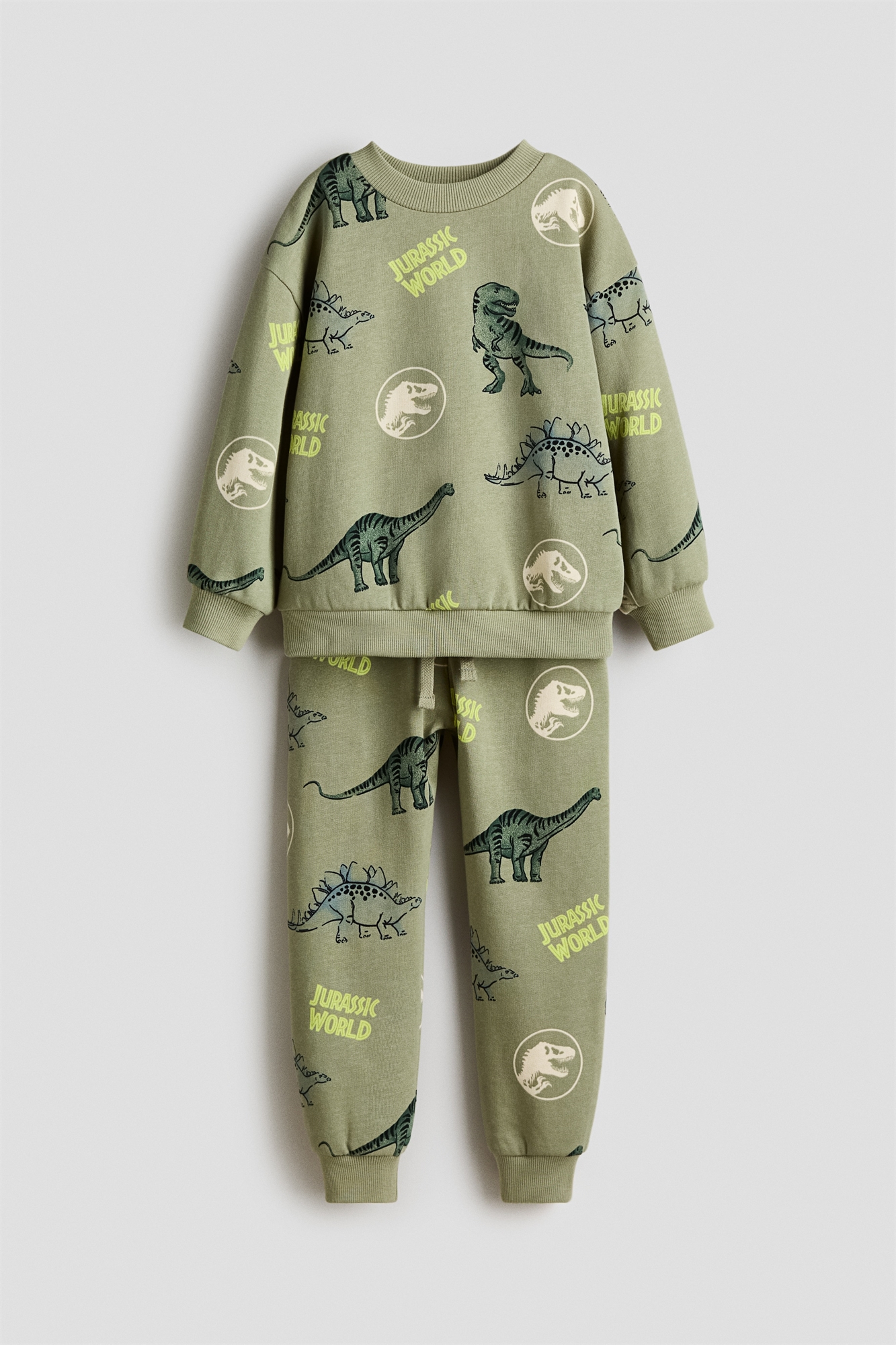 Комплект из топа и пары джоггеров из принтованной толстовки с мягким начесом внутри. Топ с круглым вырезом в рубчик, спущенными плечами, длинными рукавами, манжетами и подолом в рубчик. Джоггеры с эластичным утягивающим поясом и тесемками по подолу.