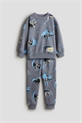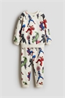 Комплект из топа и пары джоггеров из принтованной толстовки с мягким начесом внутри. Топ с круглым вырезом в рубчик, спущенными плечами, длинными рукавами, манжетами и подолом в рубчик. Джоггеры с эластичным утягивающим поясом и тесемками по подолу.