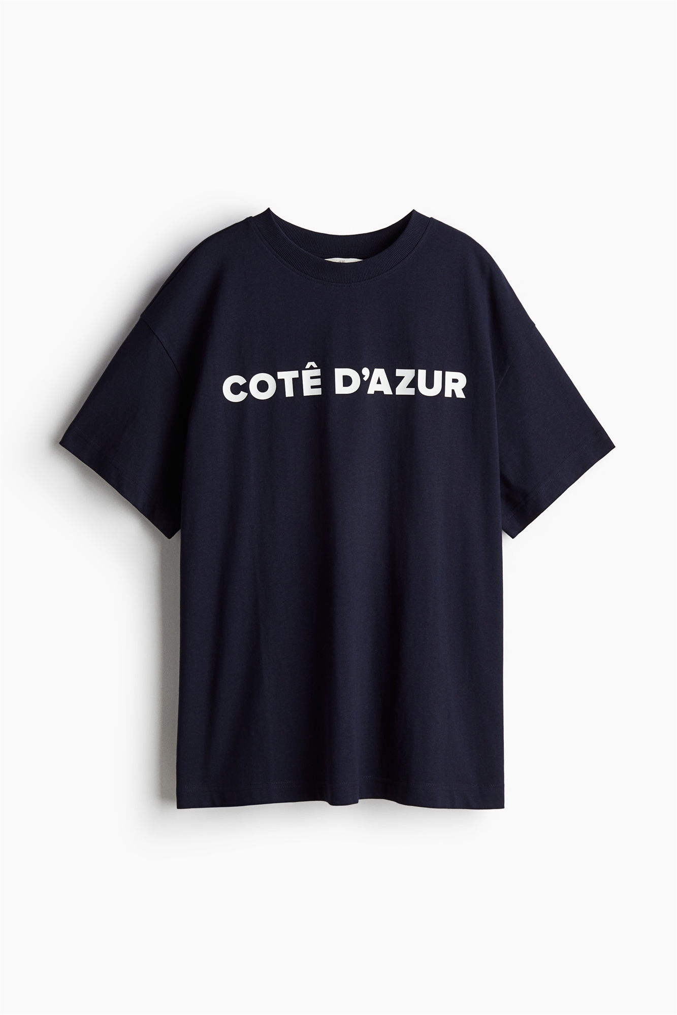 Футболка оверсайз из мягкого хлопкового джерси с принтом спереди, круглым вырезом с ребристой отделкой и спущенными плечами.