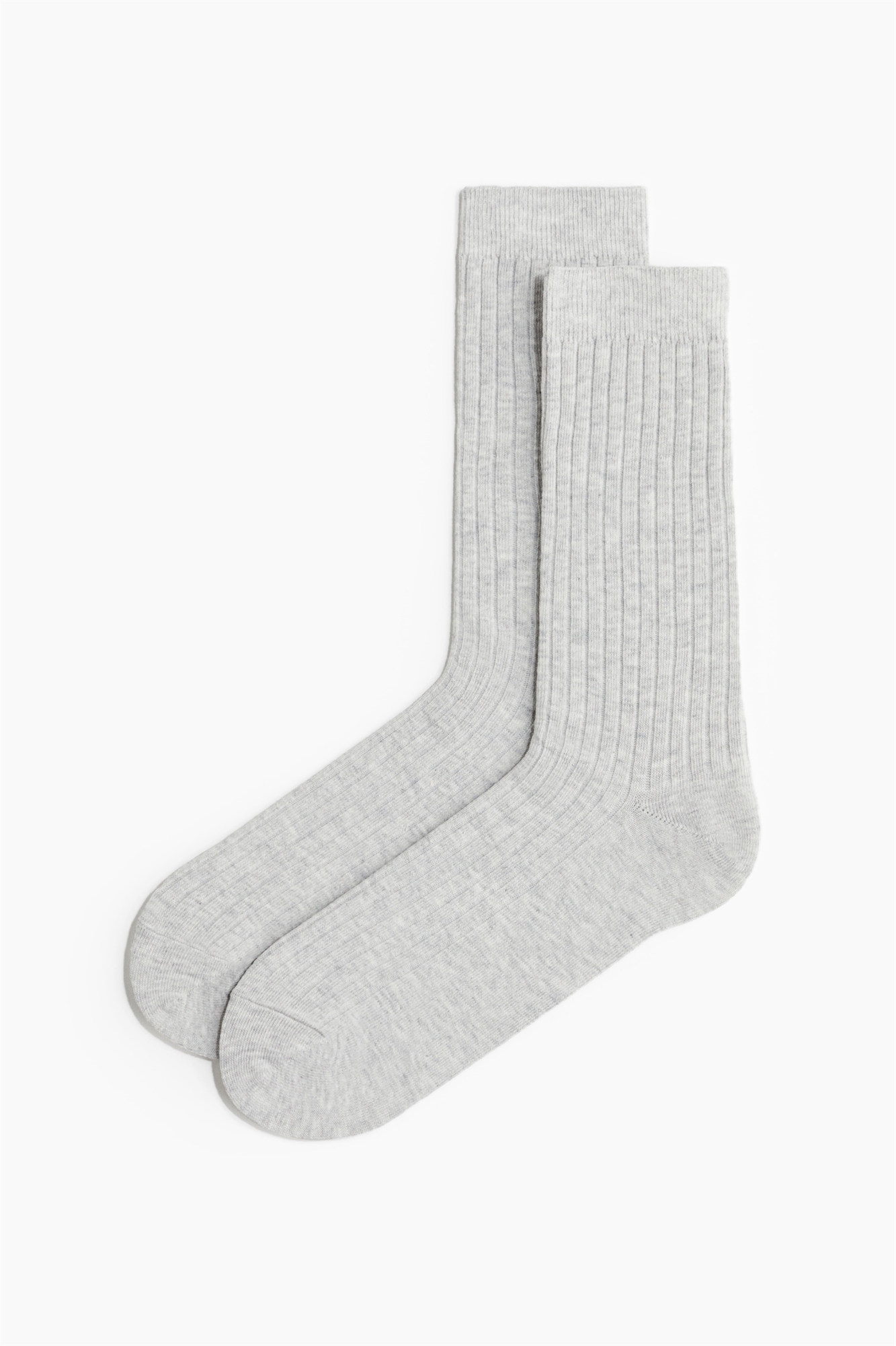 Носки из тонкого хлопкового трикотажа с ребристым голенищем и эластичным верхом.