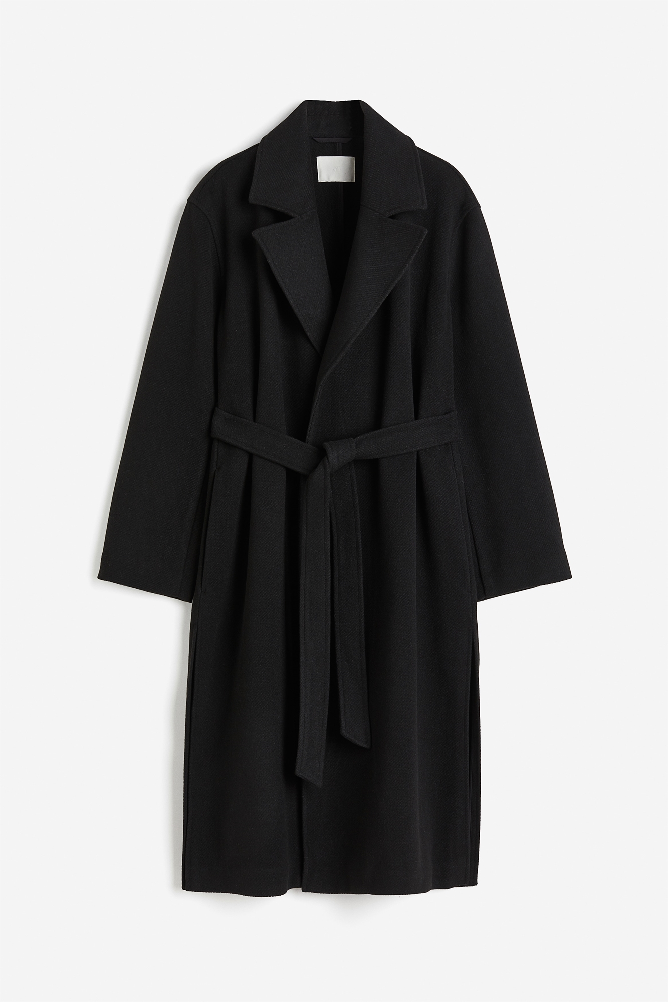 Пальто из ткани длиной до колен с отложным воротником и широким съемным поясом-завязкой на талии. Слегка спущенные плечи и незаметные карманы в боковых швах. Прямой подол с боковыми разрезами. Без подкладки.