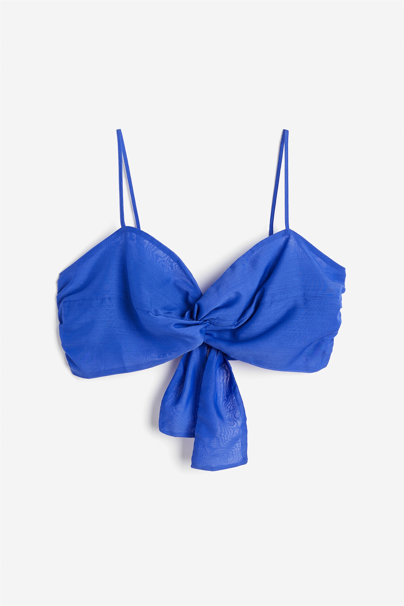 Обрезанный пляжный топ из полотняного переплетения с вырезом в форме сердца и регулируемыми бретелями-спагетти. Двухслойный, с перекрученной деталью спереди, собранными боковыми швами и широкими бретелями, которые завязываются бантом сзади.