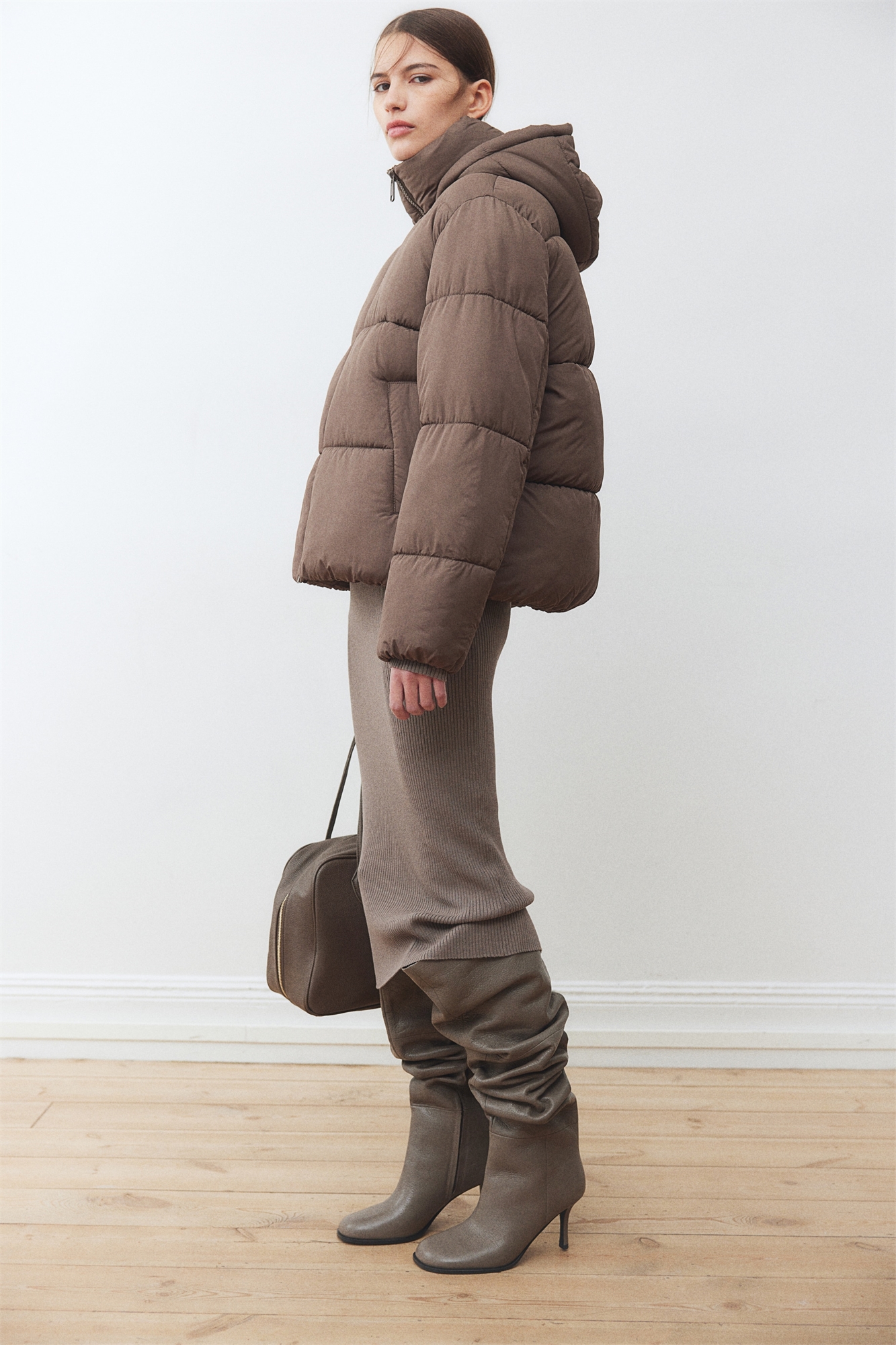 Пуховая куртка свободного покроя со стеганым переплетением. Капюшон, воротник-стойка и застежка-молния спереди с защитой подбородка от натирания. Слегка спущенные плечи, длинные рукава и втачные передние карманы. Эластичная резинка на манжетах и подоле. На подкладке.