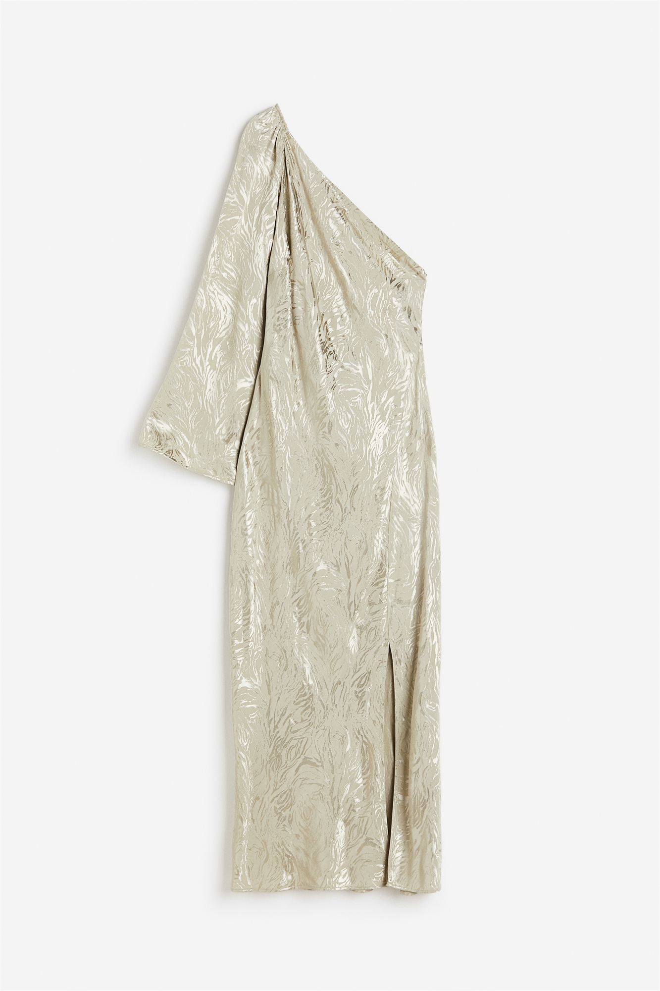 Облегающее платье длиной до колен из переливающейся вискозной ткани с жаккардовым узором. Одно открытое плечо и длинный широкий рукав реглан со сборками у плеча. Очень глубокий вырез-водопад сзади с узкой бретелью, прикрепленной сверху и по бокам для регулировки. Высокий разрез для ног спереди. Частично на подкладке.