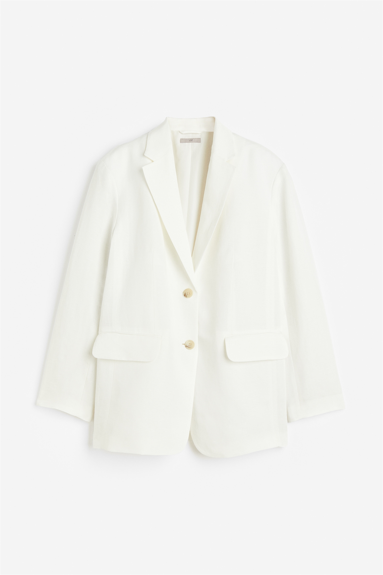 Однобортный блейзер оверсайз из льна и вискозы. Лацканы с вырезом, пуговицы спереди и накладные передние карманы. Слегка спущенные плечи и длинные рукава с декоративными пуговицами на манжетах. Одиночная вентиляция на спине. На подкладке.