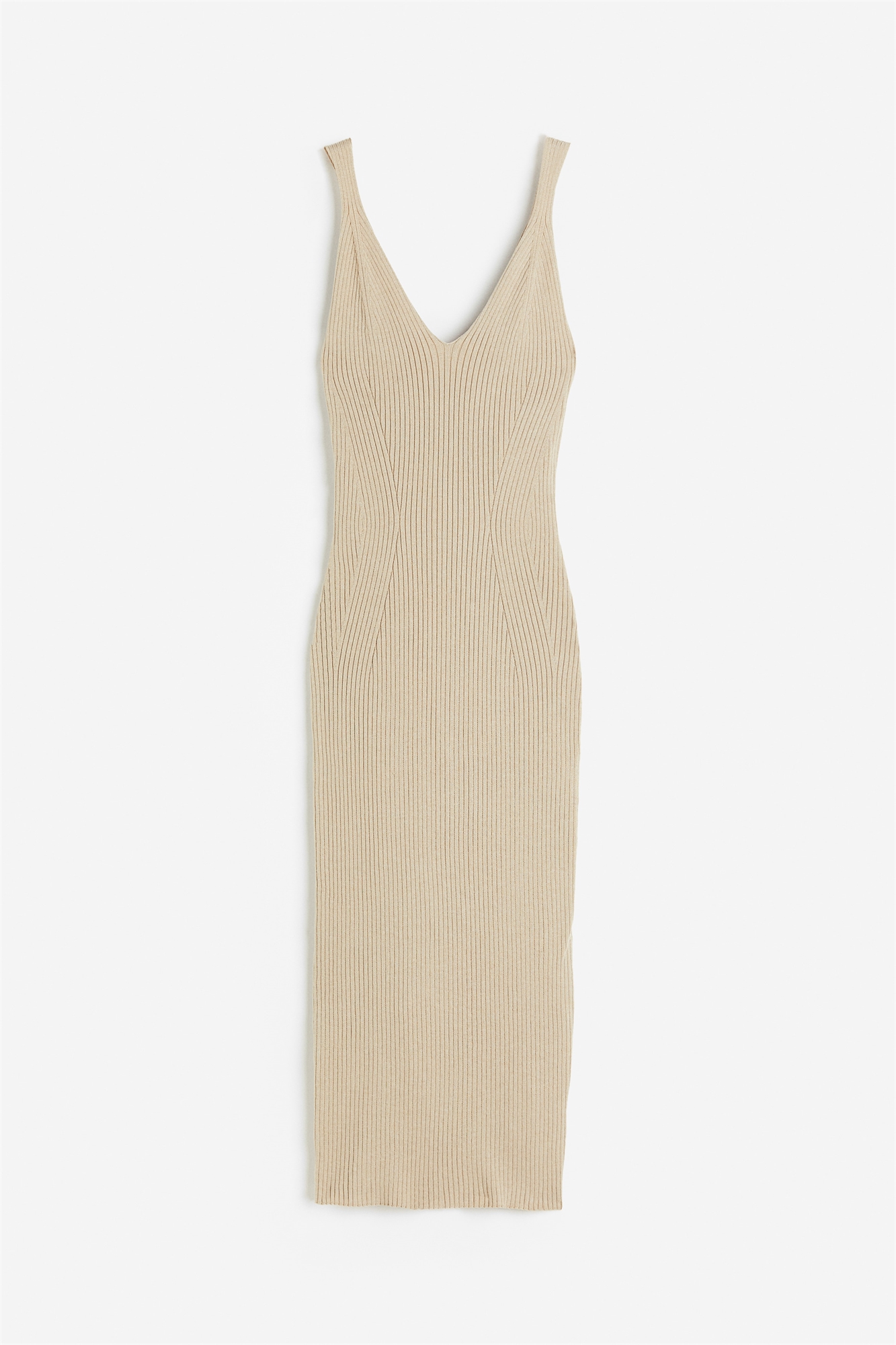 Приталенное платье без рукавов длиной до колен из мягкого трикотажа в рубчик с V-образным вырезом спереди и сзади, цельнокроеным разрезом на талии и прямым подолом.