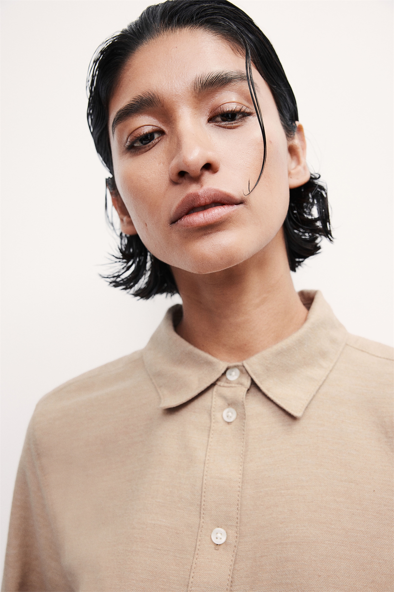 Рубашка из мягкой хлопковой фланели с воротником, застежкой на пуговицы спереди и ярмом с коробчатой складкой сзади. Длинные рукава с манжетами на пуговицах и рукавной планкой с пуговицей. Закругленный подол.